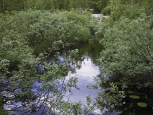 Partivis raskt rinnande bäck omgiven av mestadels videsnår/videkärr.