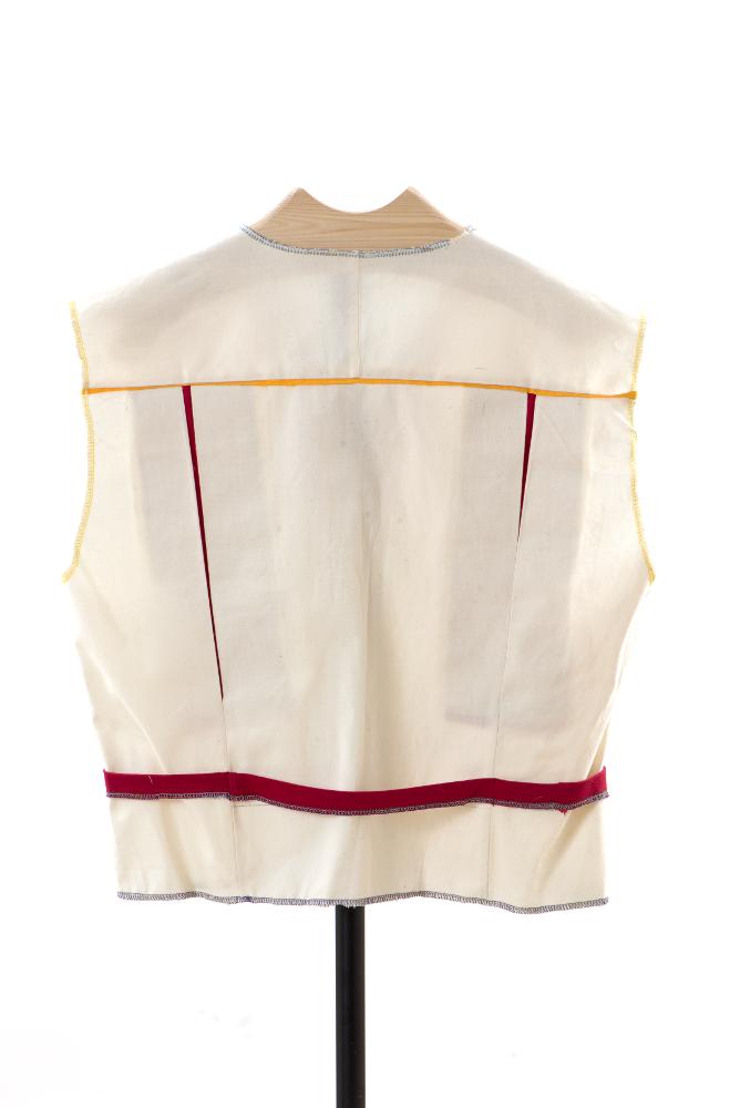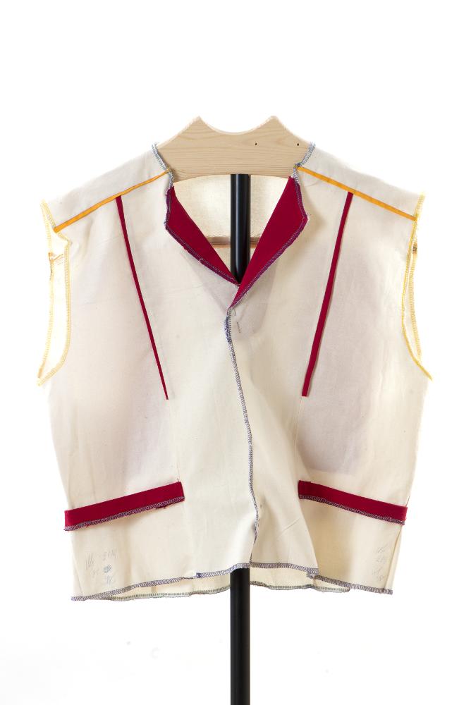 - Föremålet är en prototyp till plagg som Karin Vasara senare har tillverkat. Konsthantverkaren har berättat att det är en toall för en väst men att den även har används som mönster för många jackor. Många har gillat den modellen.