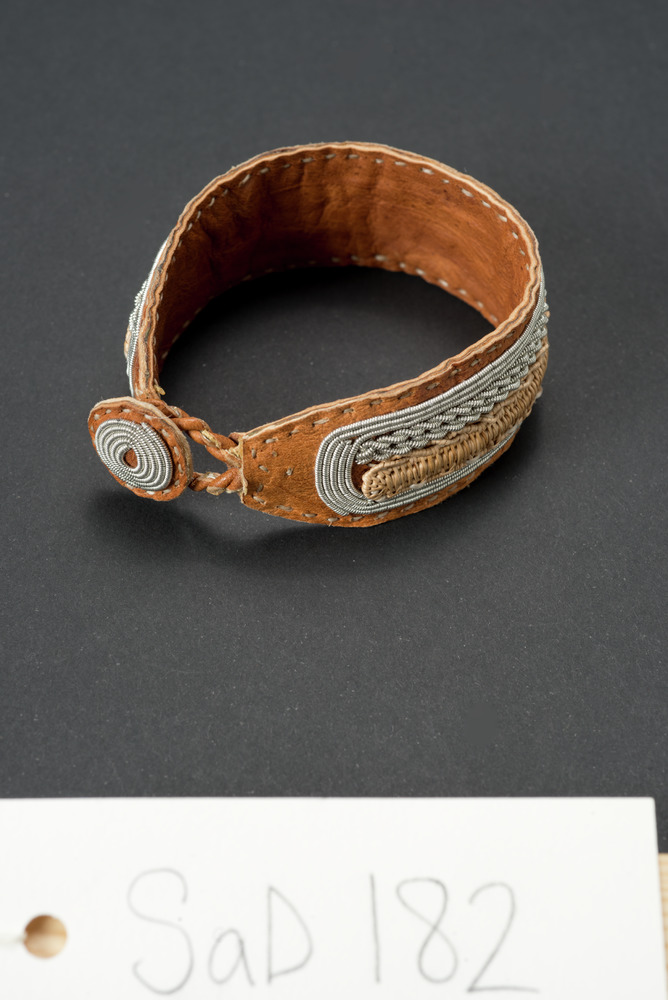 - Ett armband som är dekorerad med tennbroderi och en flätad rotdel. Detta är fäst på ett garvat skinn. En knapp i skinn som är tennbroderad som stängning. Armbandet är fodrat i skinn. Det finns en märkning på baksidan som inte går att tyda. Sytt med fusksena.