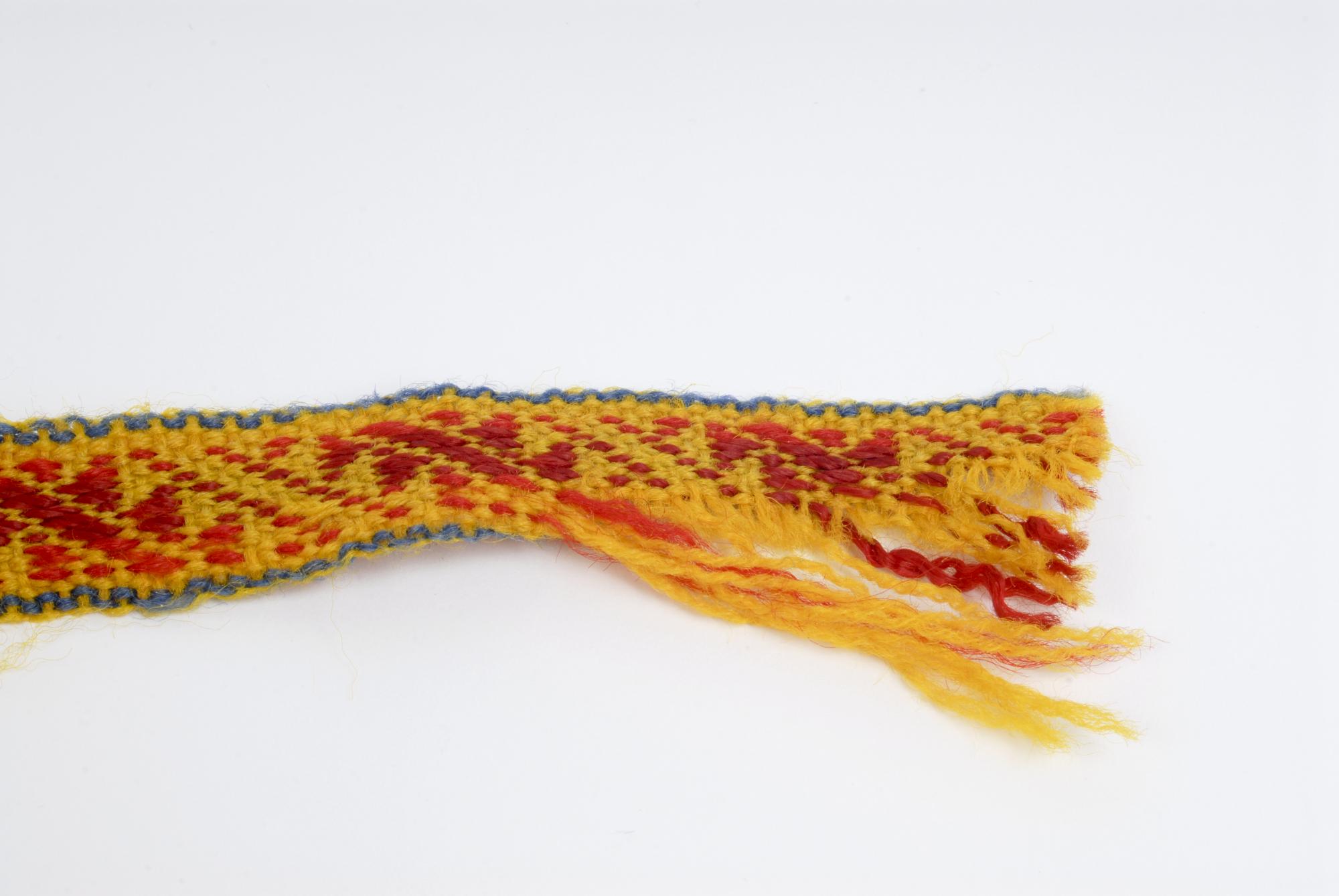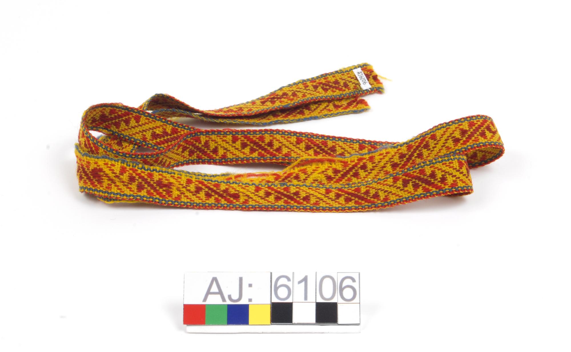 Vävt band i plockmönster. Bottenfärg: gult. Kanttrådar i grönt och rött. De röda mönstertrådarna är mer brunröda i mitten, klarröda i sidorna. Förklädesbandsmönster.