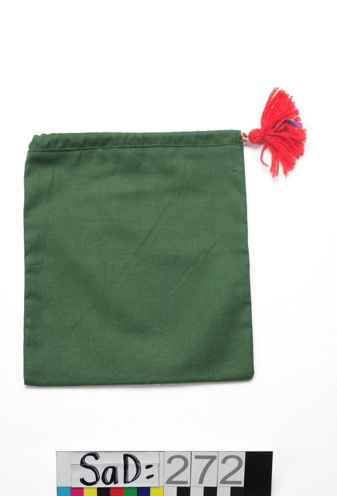 Föremålet är en mörkgrön tygpåse med en dragsko. En flätad snodd men tofs, fyrfläta i färgerna gult, vitt, blått och rött fungerar som påsens stängning. Det finns totalt nio stycken liknade påsar i samlingen av föremål från Sámi Duodji.