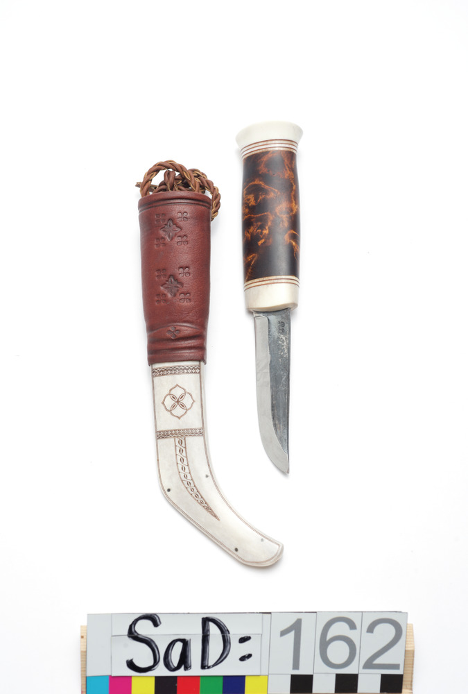 Föremåletl är en kniv med hornslida med läderholk. Hornet är graverat och på knivens baksida finns signaturen Per Jakob Utsi 2005. Läderholken är dekorerad.