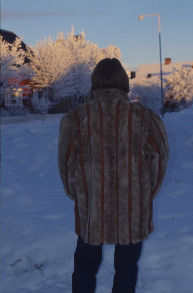 Kvinna bärandes pälsjacka, bilden är fotograferad bakifrån