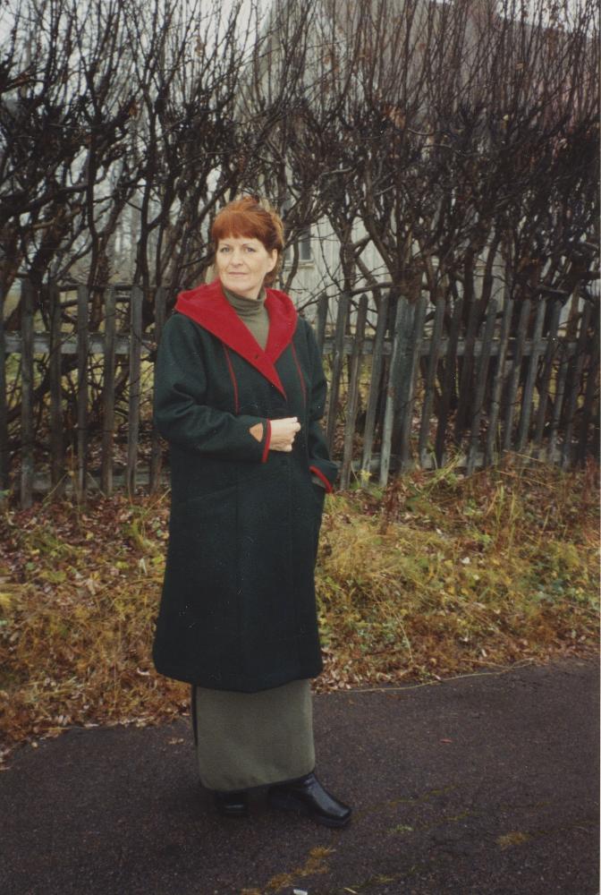 Stående kvinna bärandes jacka i vadmal, bilden är fotograferad snett framifrån