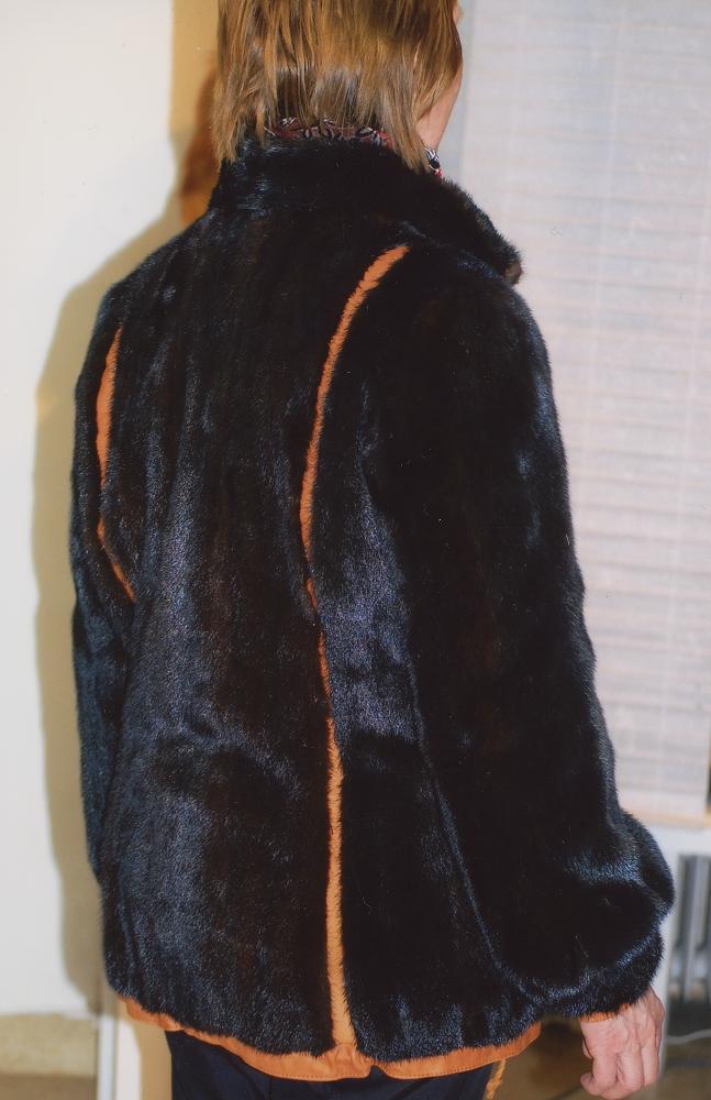 Stående kvinna bärandes pälsjacka, bilden är fotograferad snett bakifrån