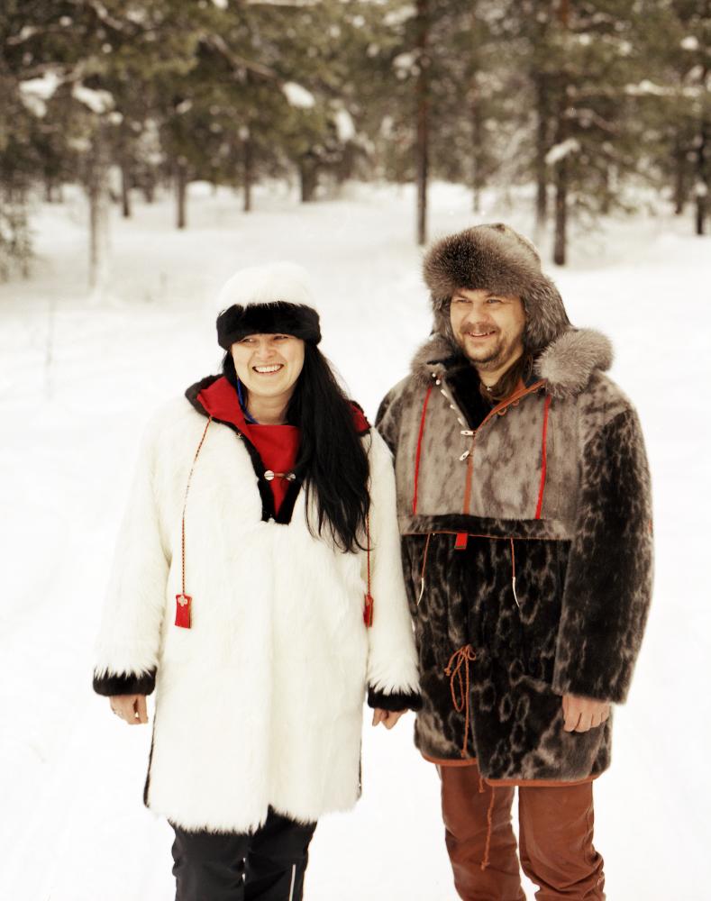Man och kvinna bärandes pälsjackor och pälsmössor