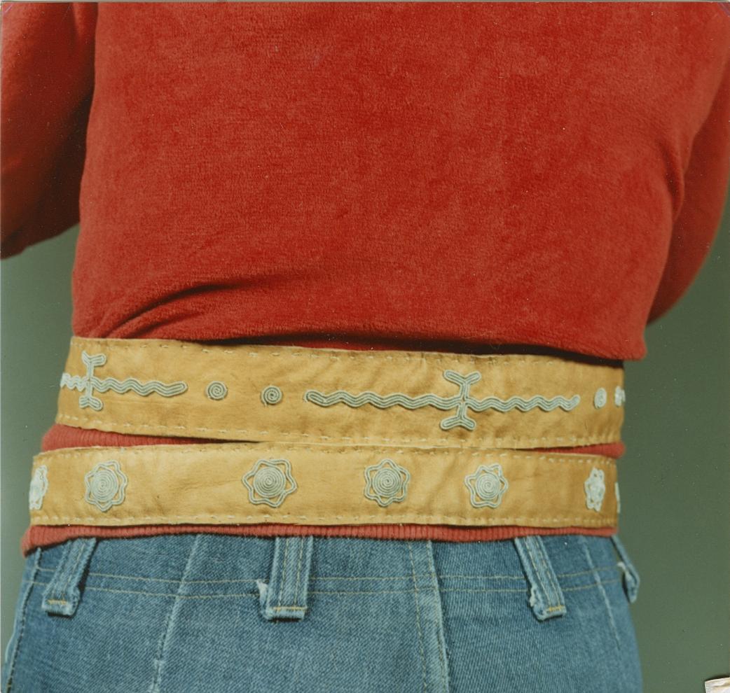 Duodje av Svea Länta. Två bälten i skinn med tenntrådsbroderi.
