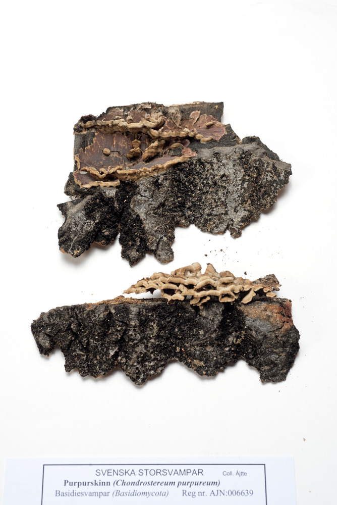 Purpurskinn är allmän i södra och mellersta Sverige, men är sällsynt i inre Norrland, såsom i detta fall Jokkmokk. Den växte på en asp i Jokkmokks fjällträdgård, som var ringbarkad några år tidigare och dog under sommaren 2019. I ringbarksskadan hade då purpurskinn kommit tillsammans med zonticka.