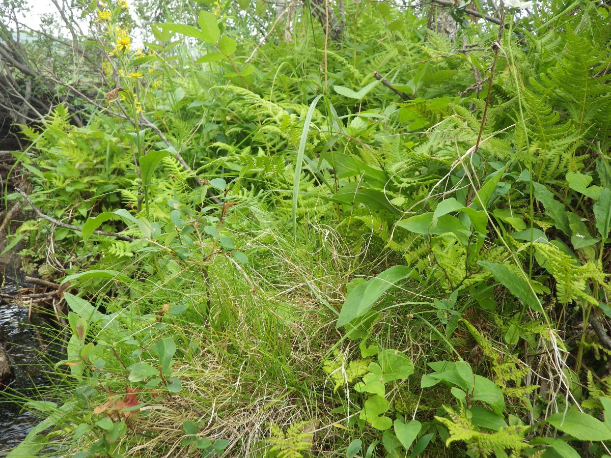 - Växter på en liten holme i Hårrejåhkå vid utloppet ur Siejdejávrásj. Här syns tågstarr (AJN:006706) och nordmyskgräs (AJN:006707) tillsammans med bl.a. ekbräken, odon, gullris och fjällskära.