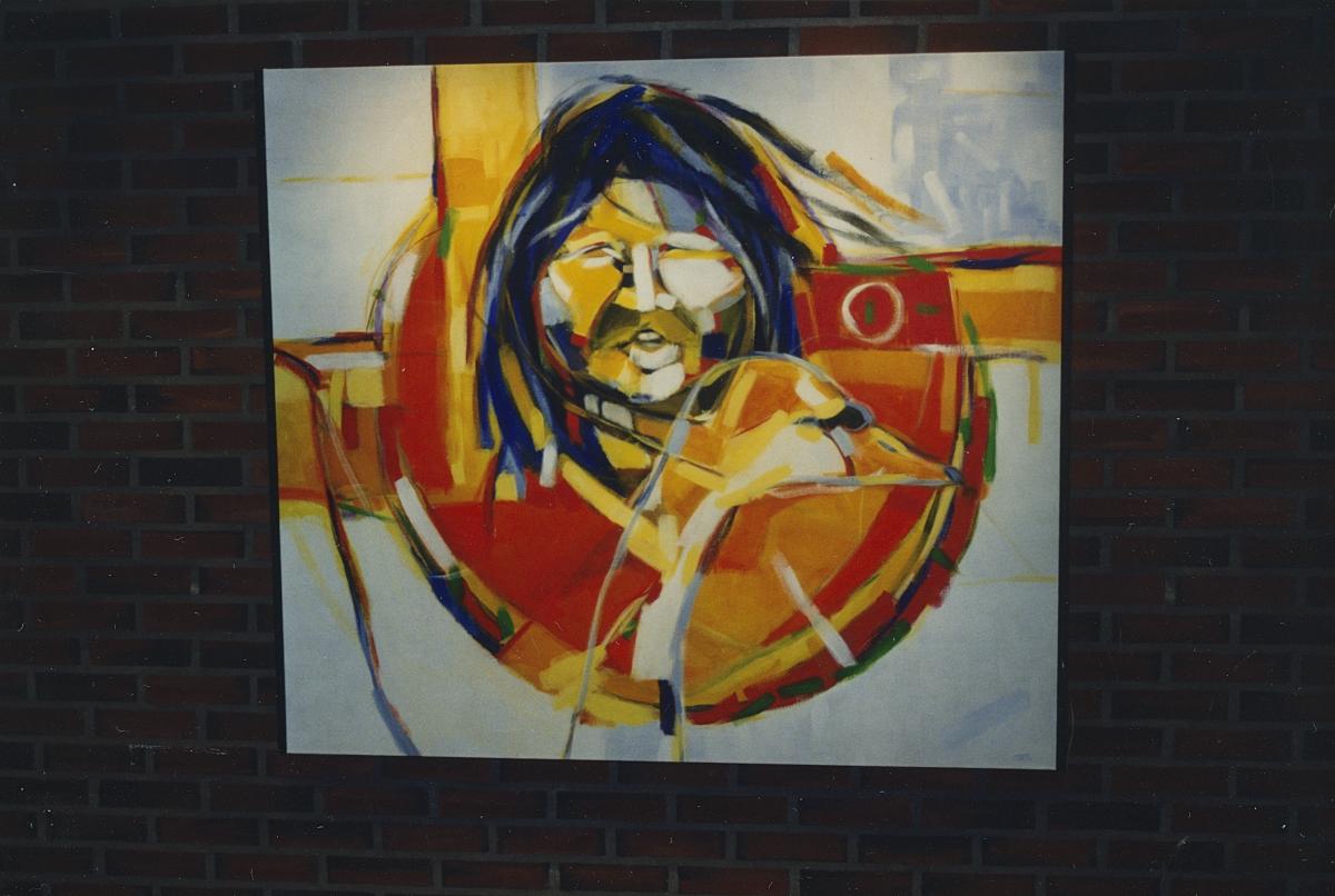 Fotografi av konstverk på en offentlig vägg. Ansikte och ceremonitrumma