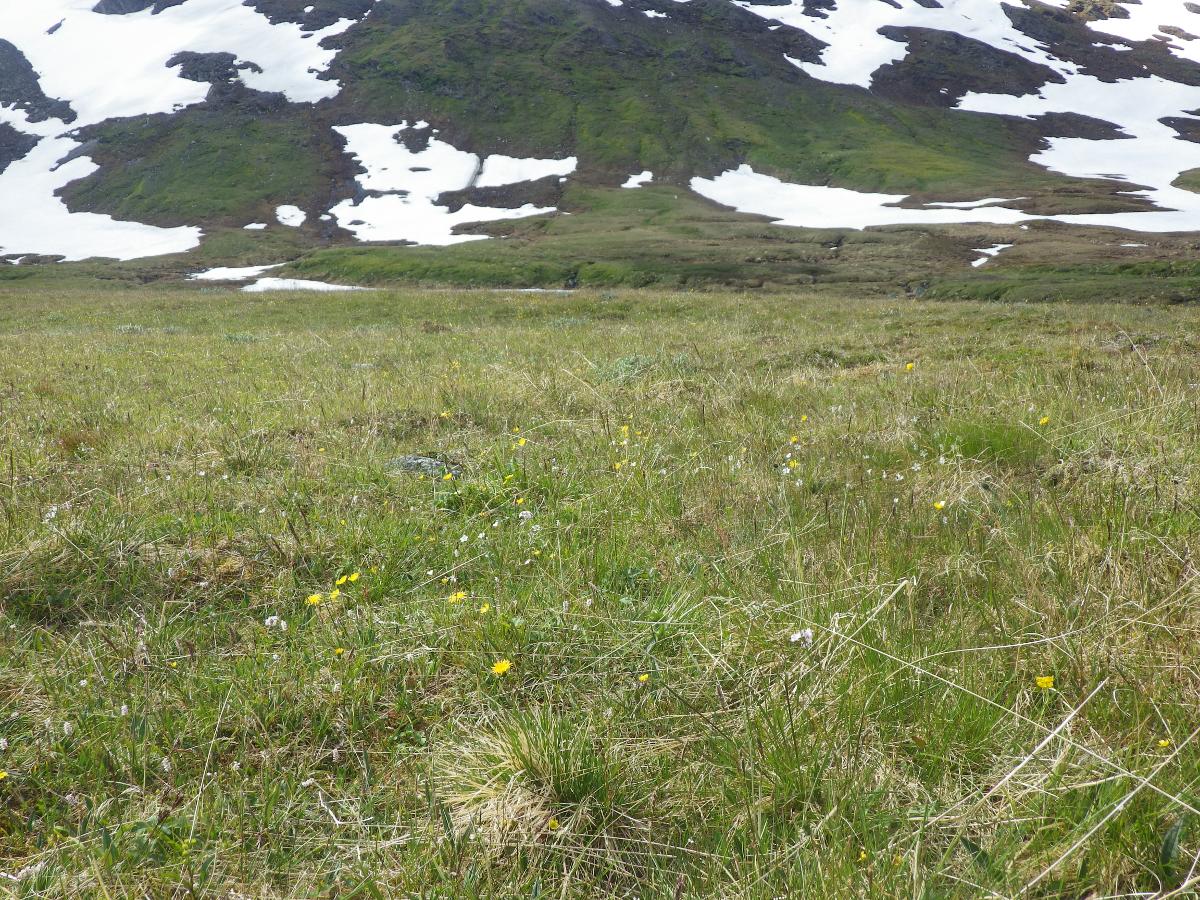 - Biotopbild av fjälläng under Goahtnjunjes nordsluttning. Polarbräsmor, fjällsmörblommor och maskrosor i förgrunden. Vid den lilla kanten 20 m bort är lokalen för fjällblära och fjällgentiana. Bilden tagen mot söder med snöfälten på Goahtnjunjes i bakgrunden.