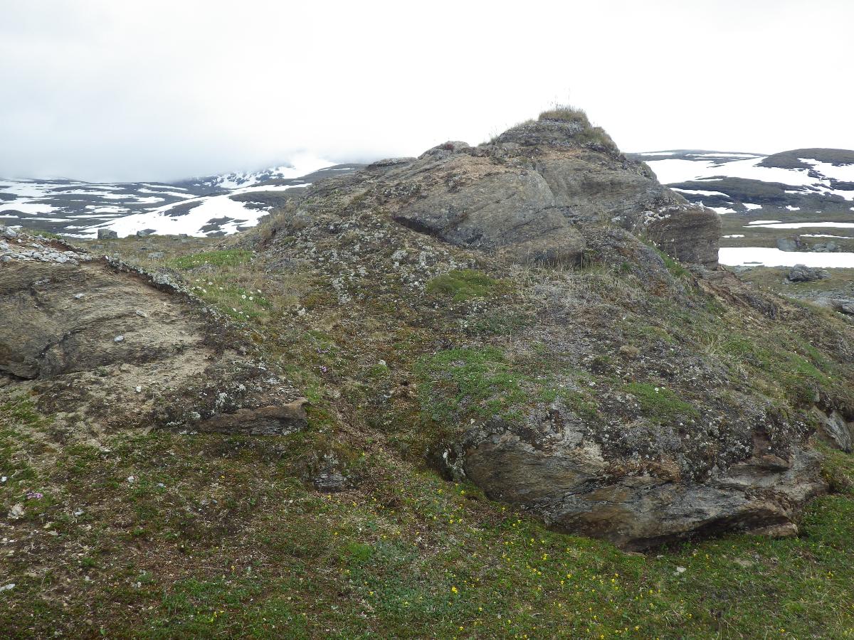 Biotopbild av klippa med blommande fjällsippor, fjällglim och fjällvioler intill boplatsen vid Gállojåhkå. Bilden tagen mot söder med Tsähkkok delvis skymd av dimma i bakgrunden.