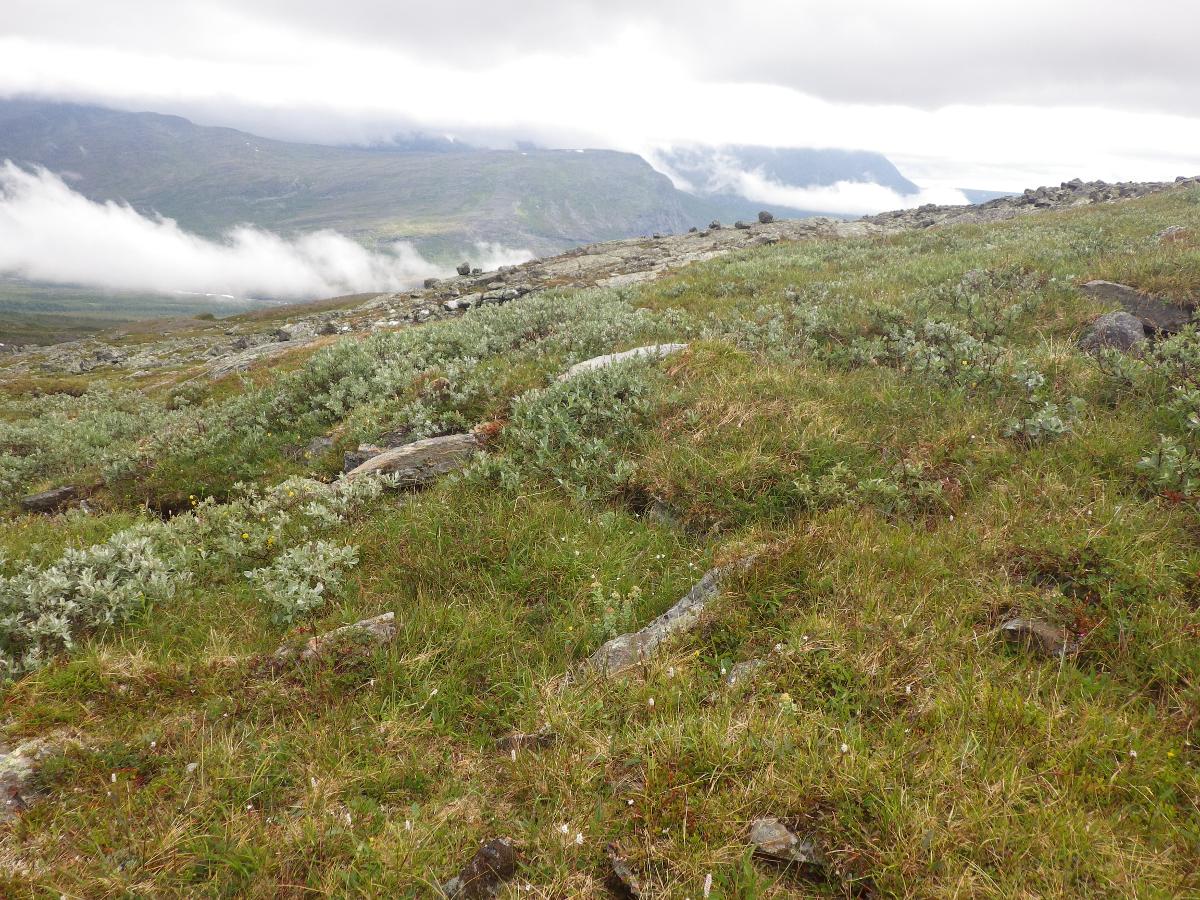 Biotopbild avfjällsluttning vid Gårssåjåhkå. Här syns bl.a. vanlig fjällarv, rosenrot, ormrot och ullvide. Bilden tagen mot NO mot Njunjesvárre på andra sidan dalen. I dalbottnen rinner Darraälven.