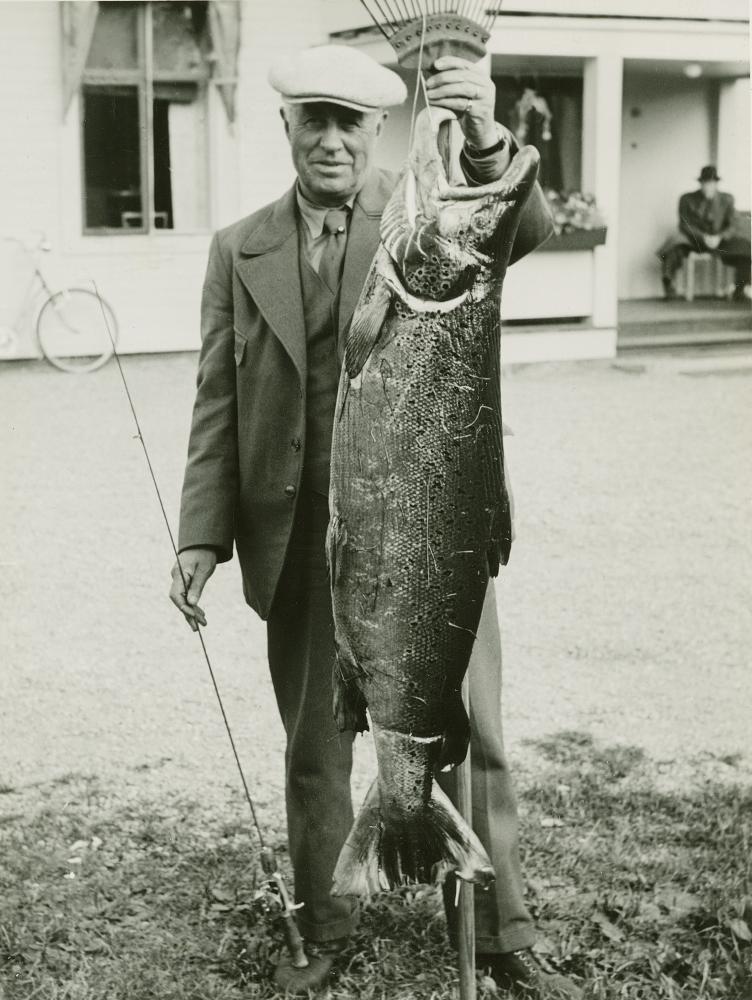 Lax på 22,5 kg fångad på kastspö i Lule älv den 30/8 1944 av Hovjuvelerare Fritz Olsson, Luleå.