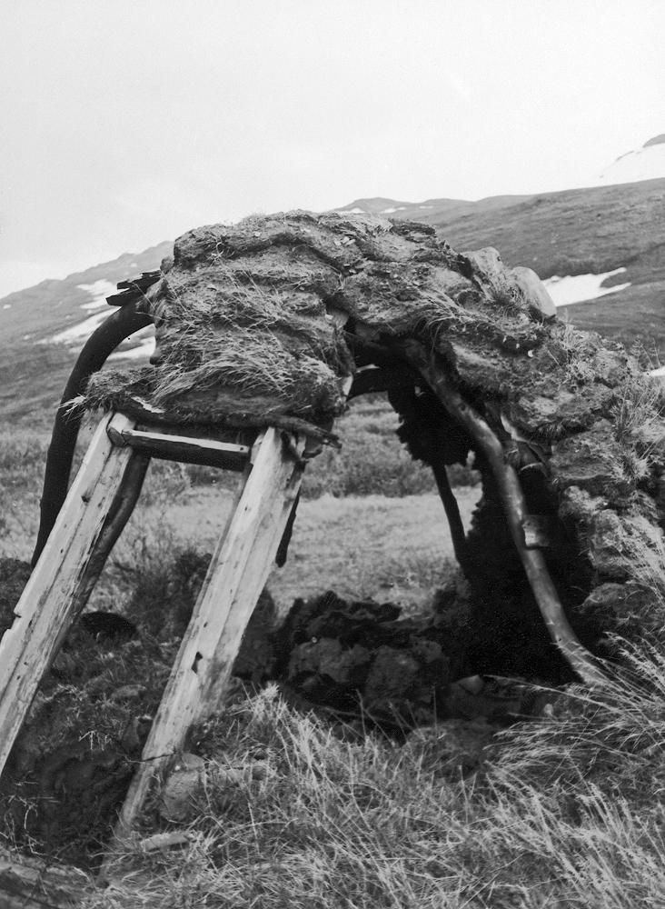 Den raserade renvaktarkåtan vid viken Sirkasluokta där de omkomna ryska krigsfångarna påträffades. Sista dagarna i juni månad 1944.