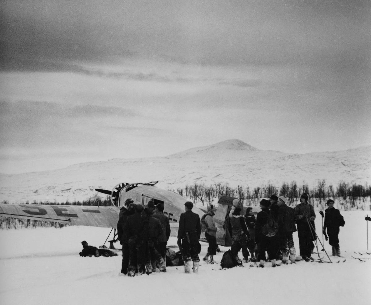 15 flyktingar har kommit till kåtan i Leipajaur, 9 på skidor och 6 till fots. De trötta och skadade fick följa med flygplanet till Kiruna medan de övriga åkte skidor vidare till Vaisaluokta. Vintern 1944/1945.