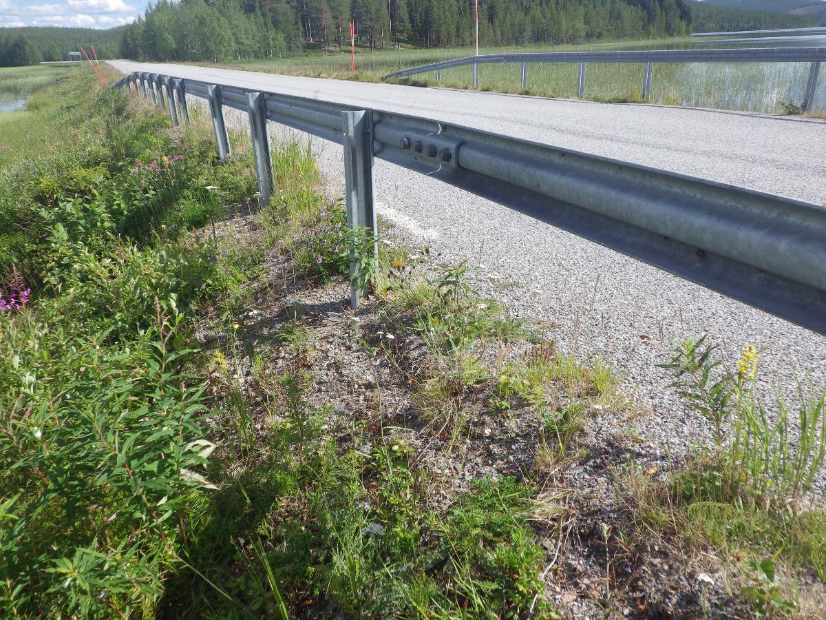 Biotopbild från öständan av Fáhsásjjávrre. Styvfibblorna står vid den närmaste räckesstolpen bland mjölke och röllika. Bilden tagen längs vägen österut.