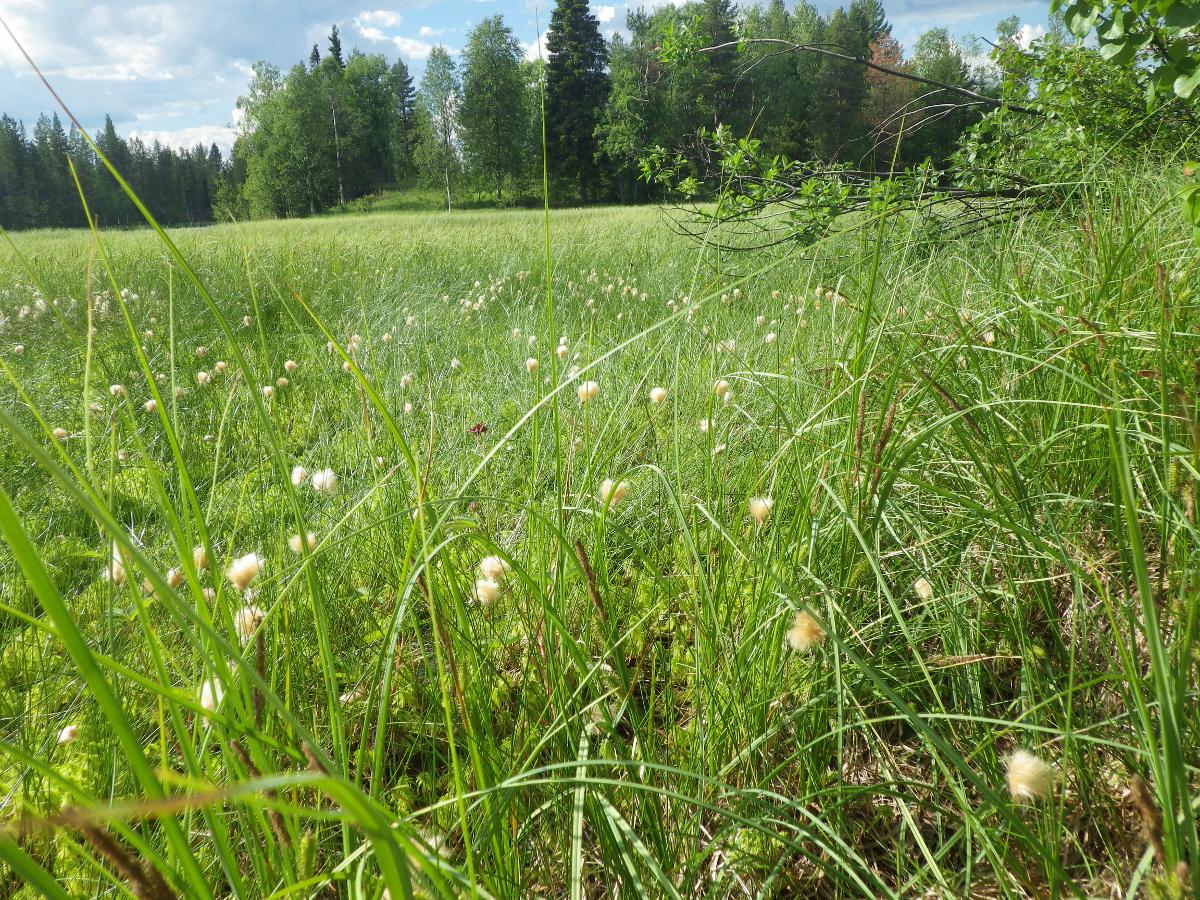 Biotopbild av myr med lappull (?) och norrlandsstarr.