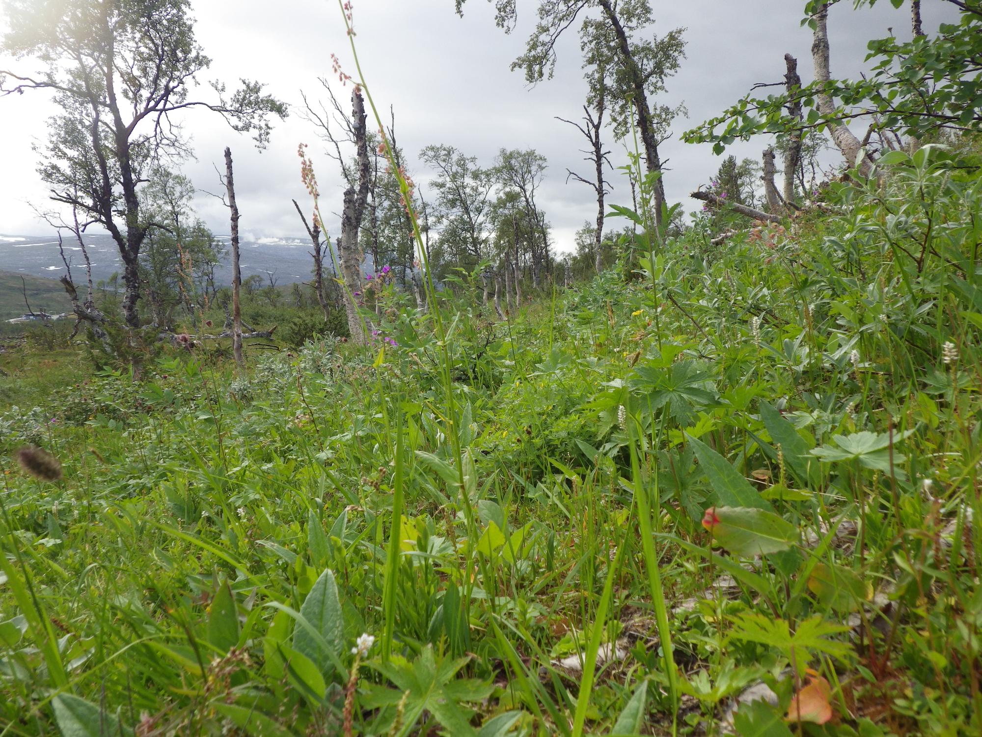 - Biotopbild av ängsbjörkskog på Skärrims sydsluttning. Här syns ormrot, fjällskära, midsommarblomster, lappsyra, strätta, vårfingerört, nordvårbrodd, säterfryle och många andra kärlväxter. Här växer också mjölkdunört, kärrdunört och raknörel. Bilden tagen mot SV med Rundhaugen i bakgrunden.