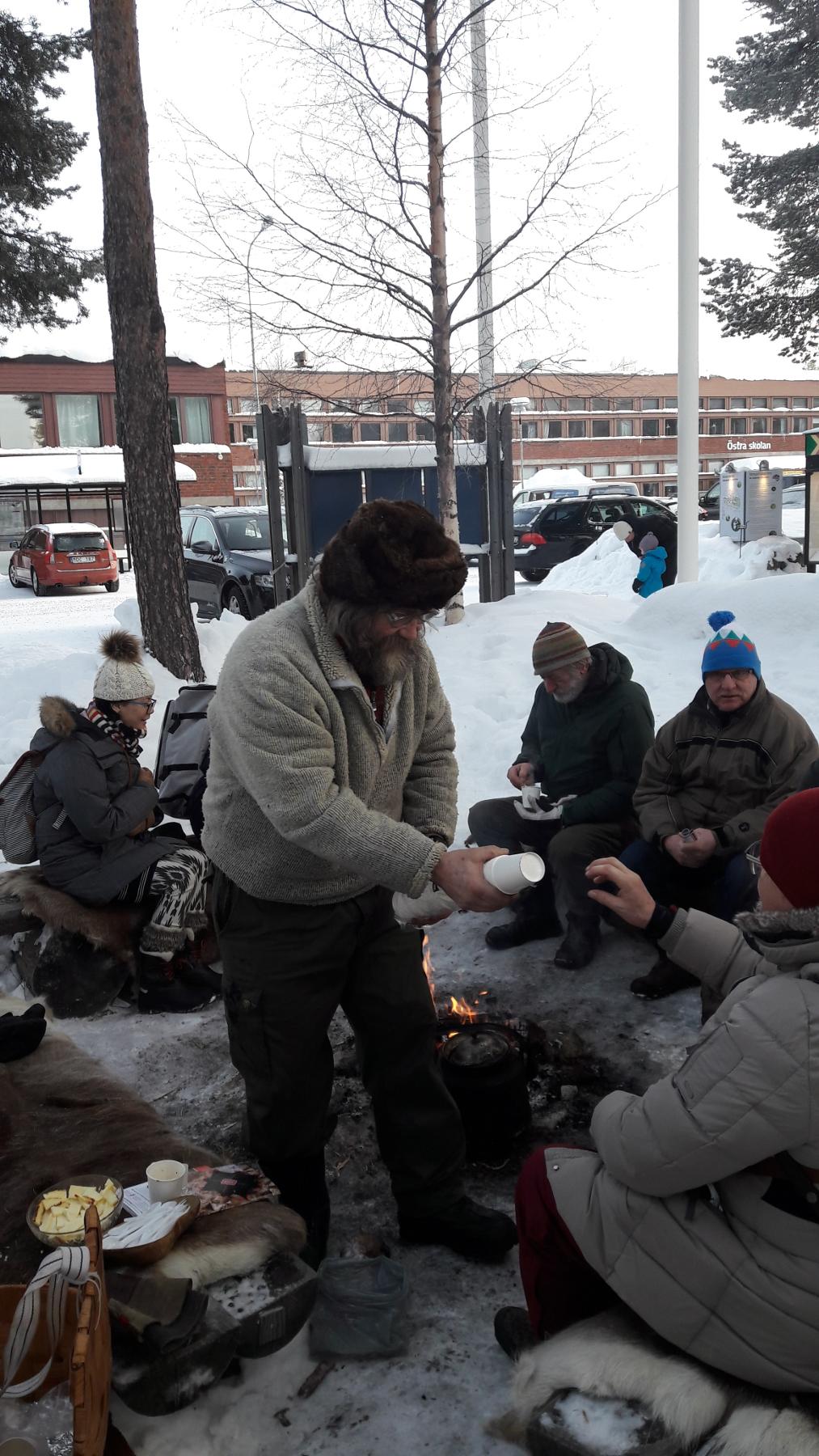 Jokkmokks marknad 2020. I museiparken bjuds besökare på kaffe kokat över elden.