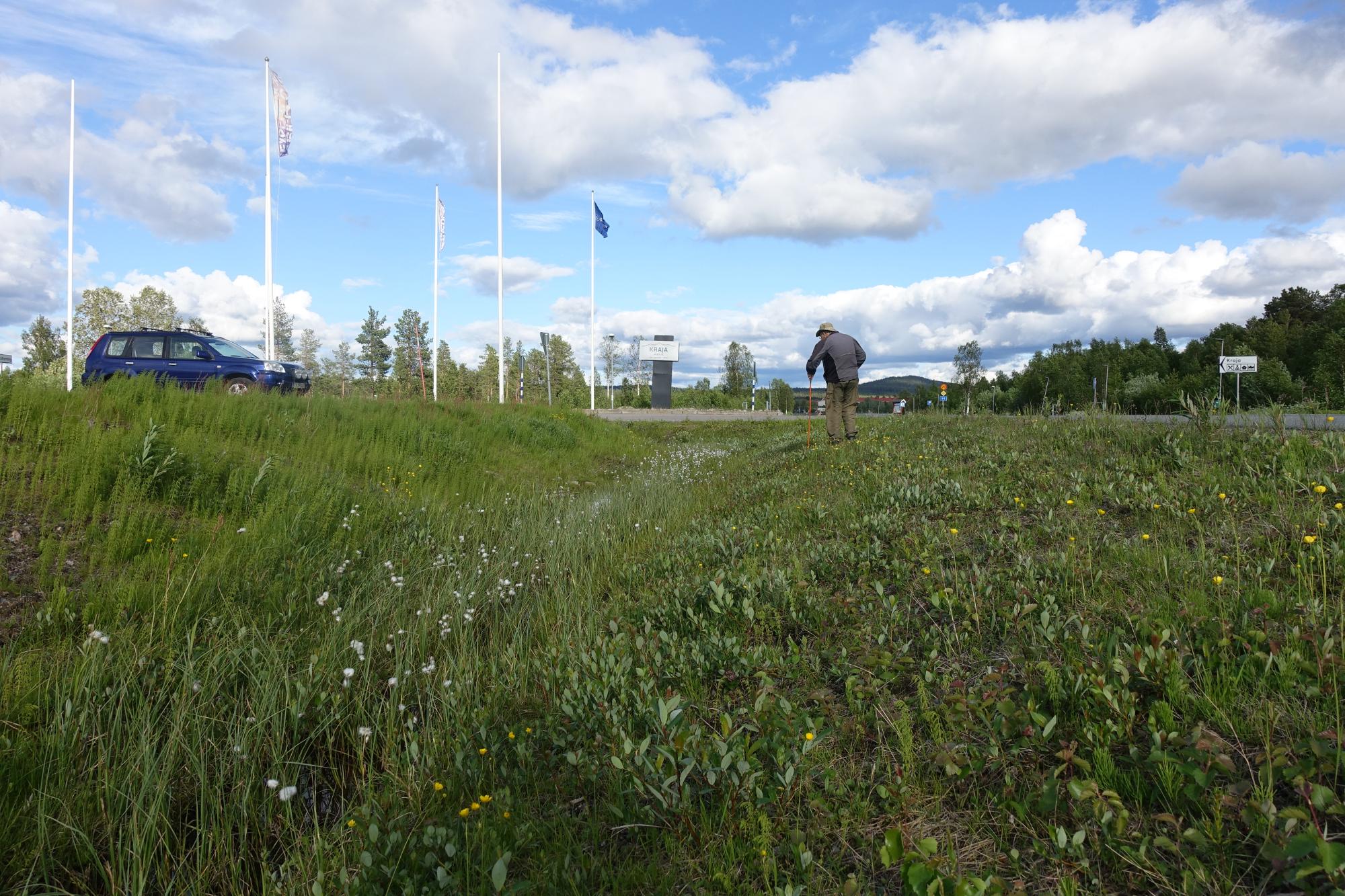 Biotopbild av vägkant med blommande smörblommor och polarull, växtplats för smalviva. Mats Nettelbladt botaniserar.