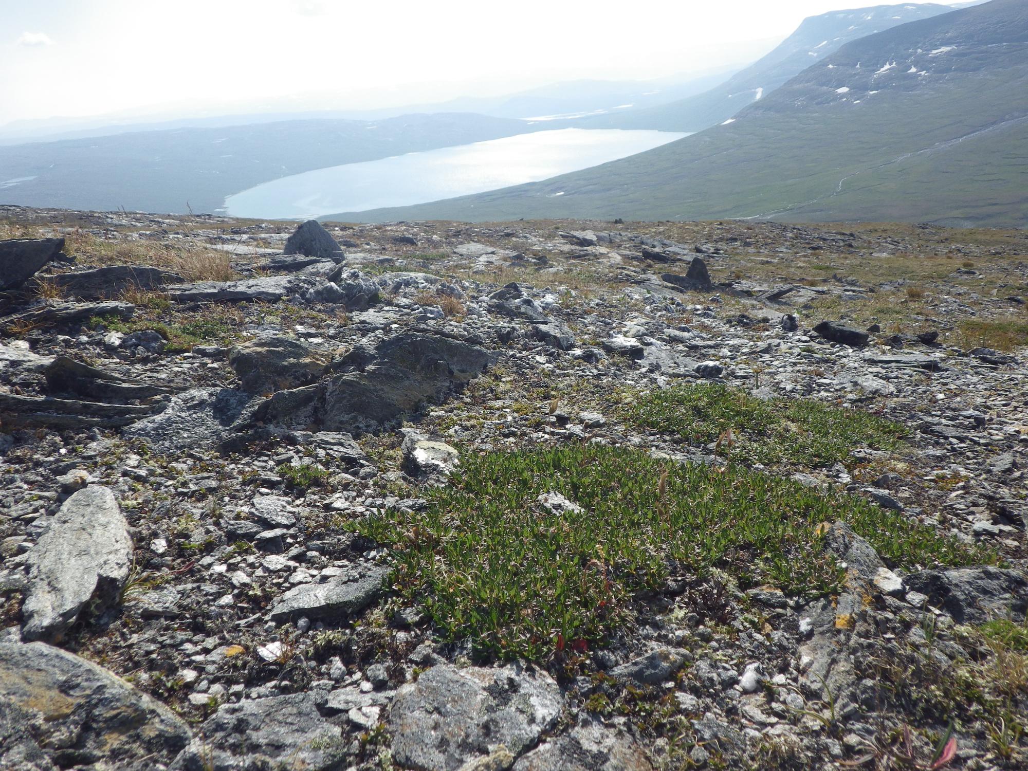Biotopbild på fjällhed med fjällsippmatta i fonden. Längre bort tuvor med groddsvingel. Bilden tagen mot SSV med Ikkesjávrre i bakgrunden. Längst bort syns Jurunjávrre.