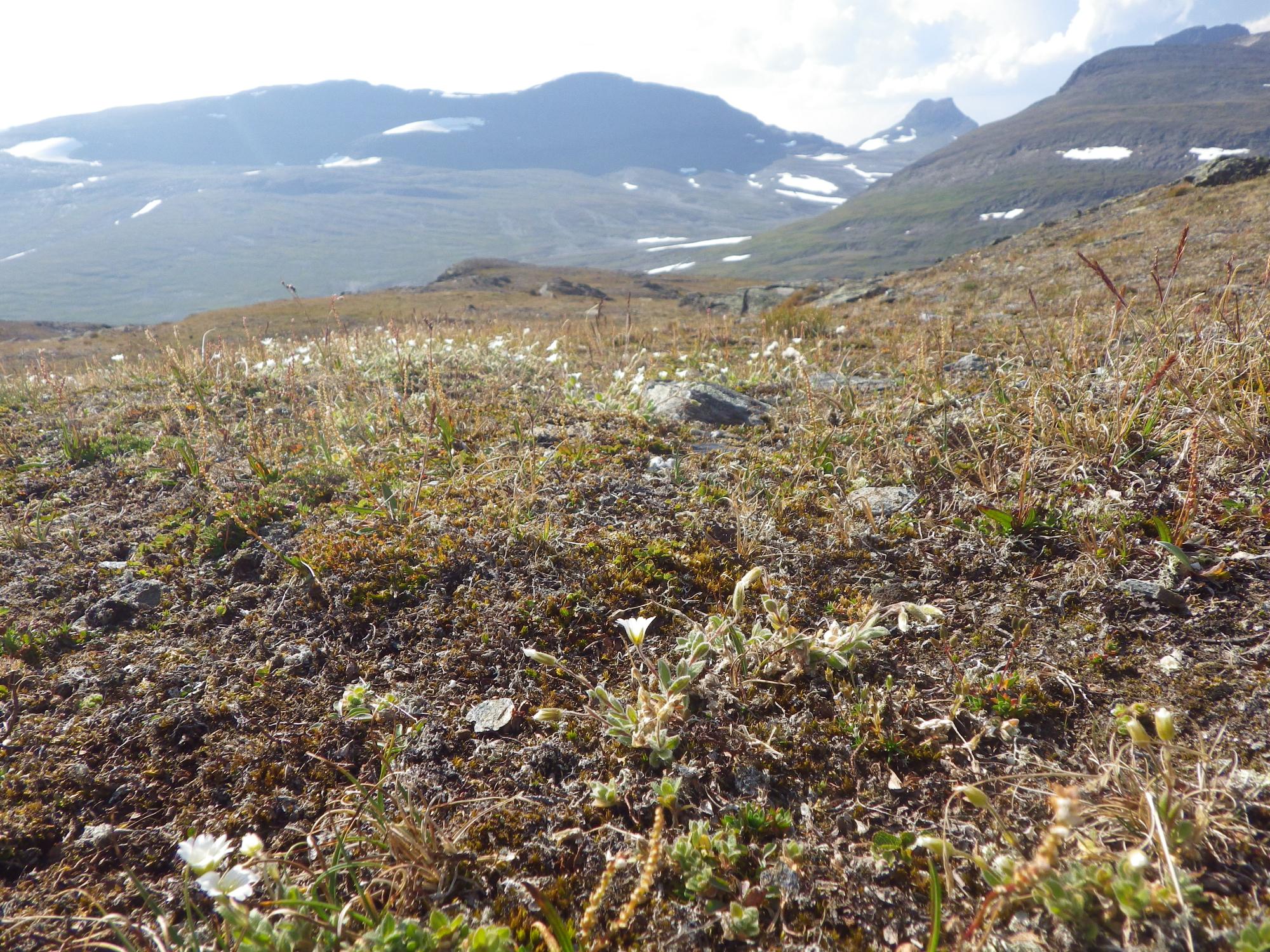 Biotopbild av fjällhed med snöarv (AJN:007633). Bilden tagen mot väster med Näjddatjåhkkå och Bállek i bakgrunden.