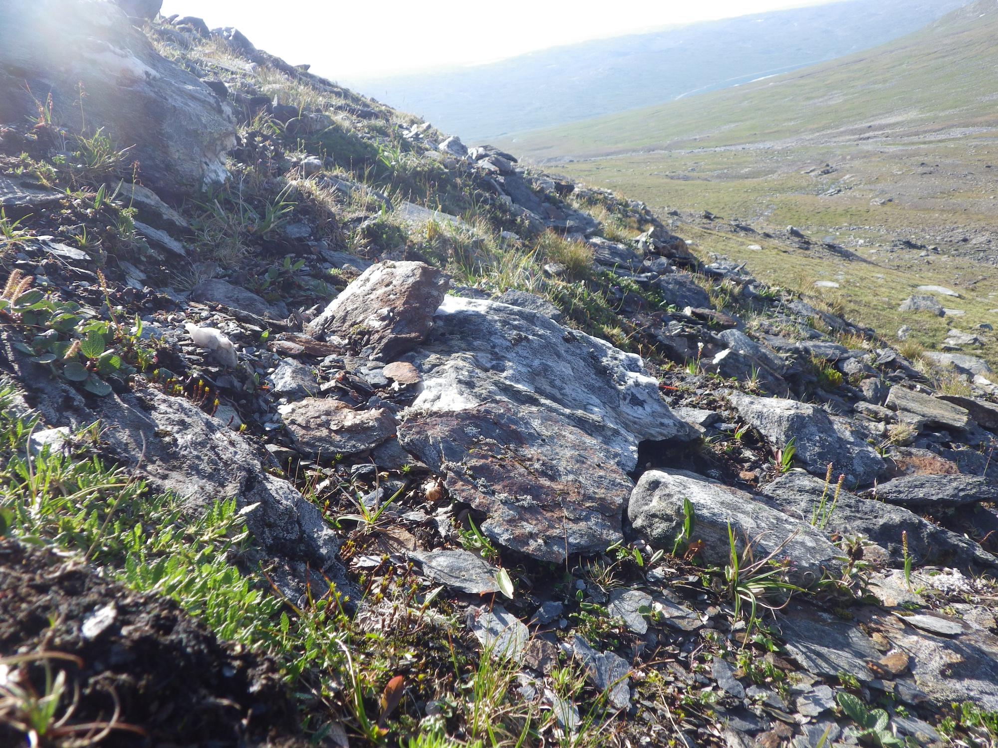 Biotopbild av stenig fjälläng med mattor av fjällsippa samt blommande fjällruta och ormrot m.m. Lokal även för svartstarr. Bilden tagen mot SV över Skårvåjåhkå.