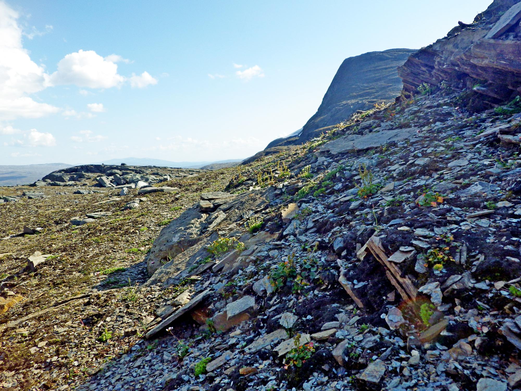 Biotopbild av fjällhed med fjällsyra, tuvbräcka och isranunkel. Bilden tagen mot söder med Näjddatjåhkkå i bakgrunden.
