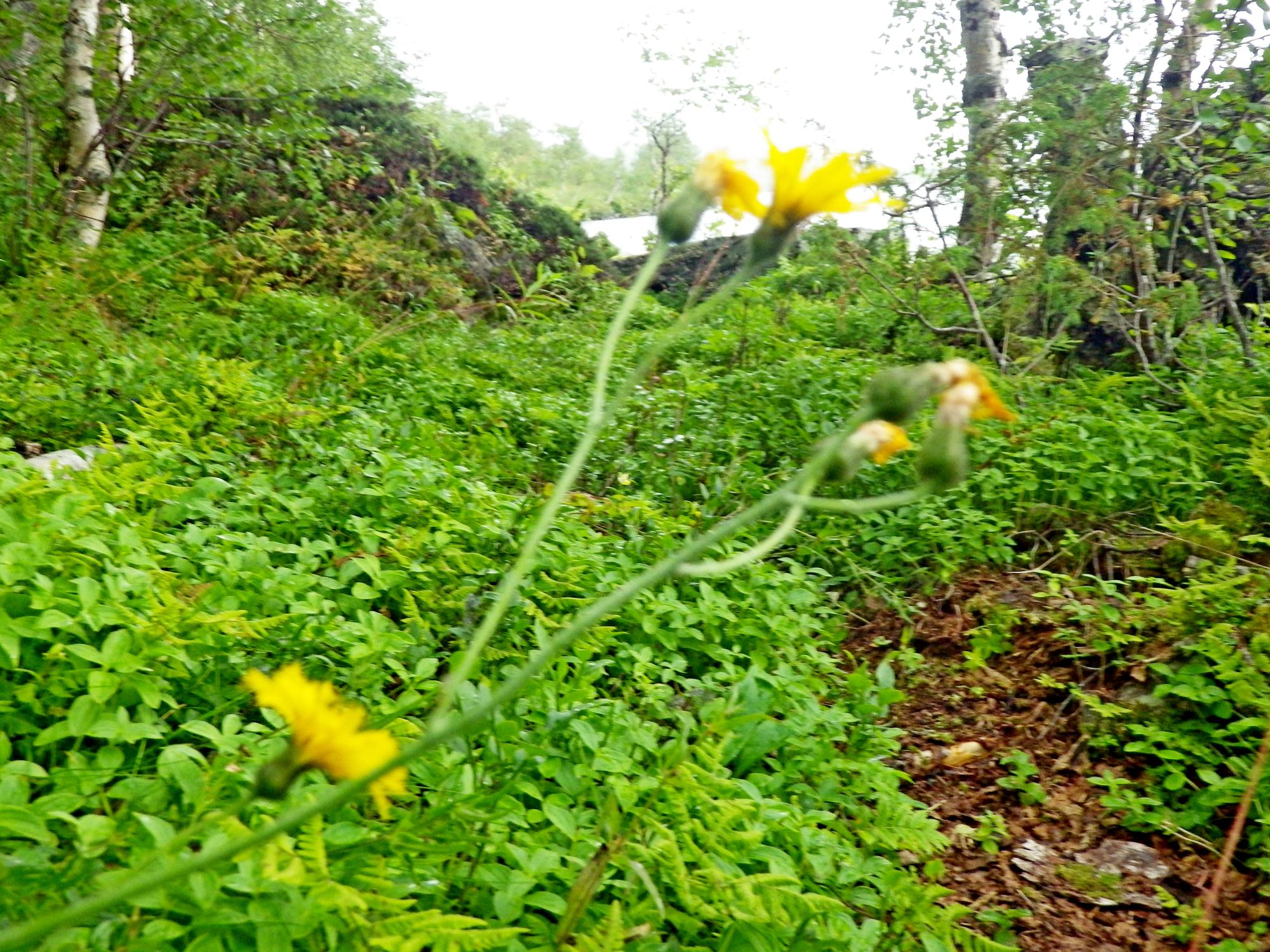 Biotopbild av hagfibblor (AJN:006631) i fjällbjörkskog. Vegetationen domineras av hönsbär och ekbräken.