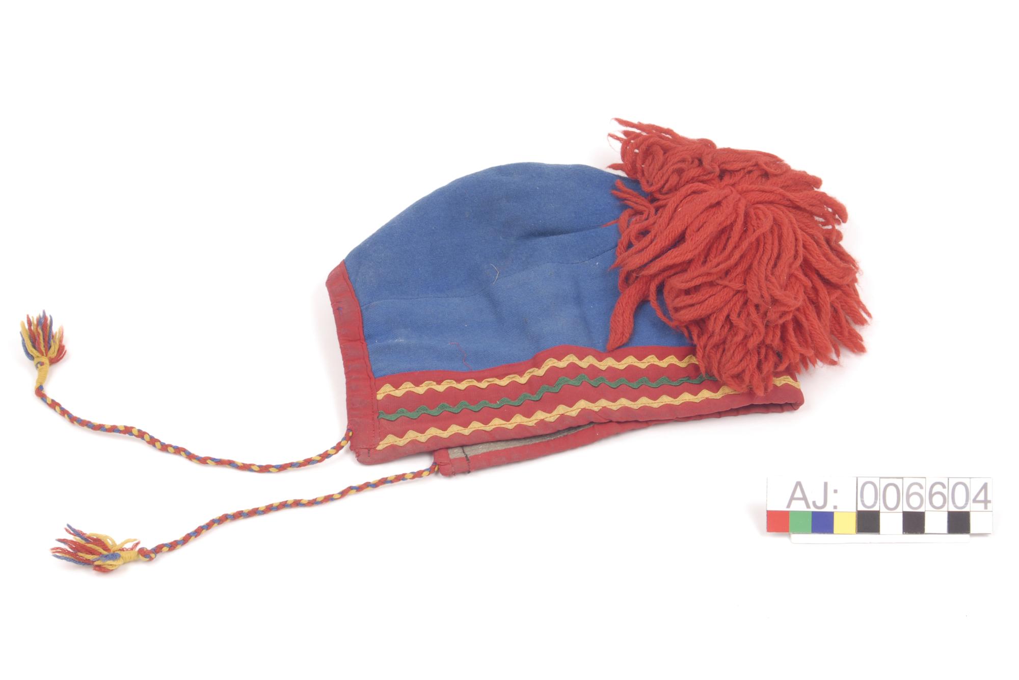Tofs av rött ullgarn. Knytband av rundflätat ullgarn i rött, gult och blått. En liten tofs i vardera ände. Mössan är ej traditionell i fråga om materialval och dekor, utan förenklad, troligen för avsalu till ickesamisk publik.