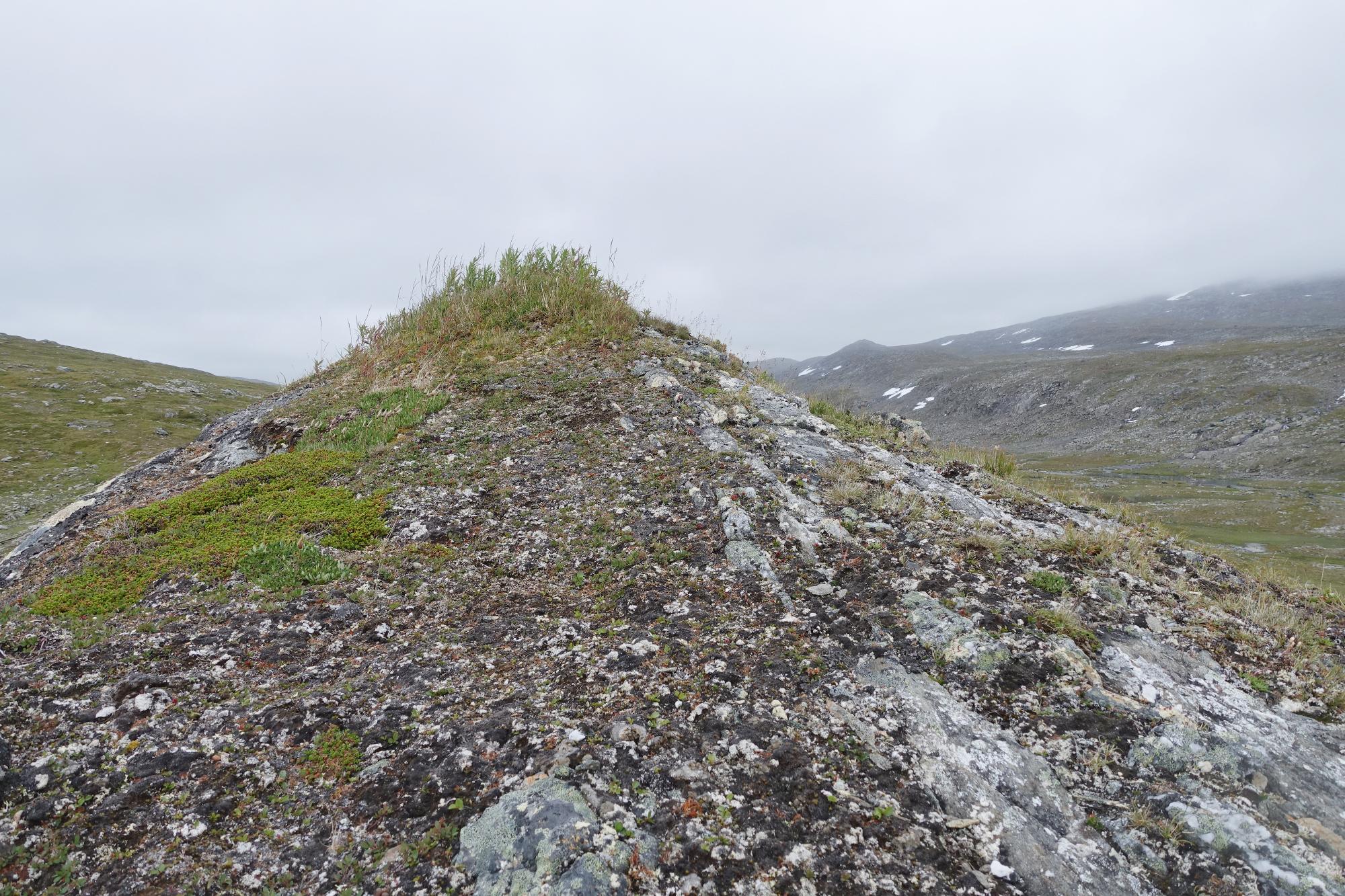 - Biotopbild av gruskulle i lågalpin terräng. (Samma kulle som AJF:59:2022:0022.) På toppen växer polarmadrör (AJN:007906) och mjölke, på gruset i fonden fjällsippa. Bilden tagen mot öster längs goahtnjunjesbäckens dalgång.