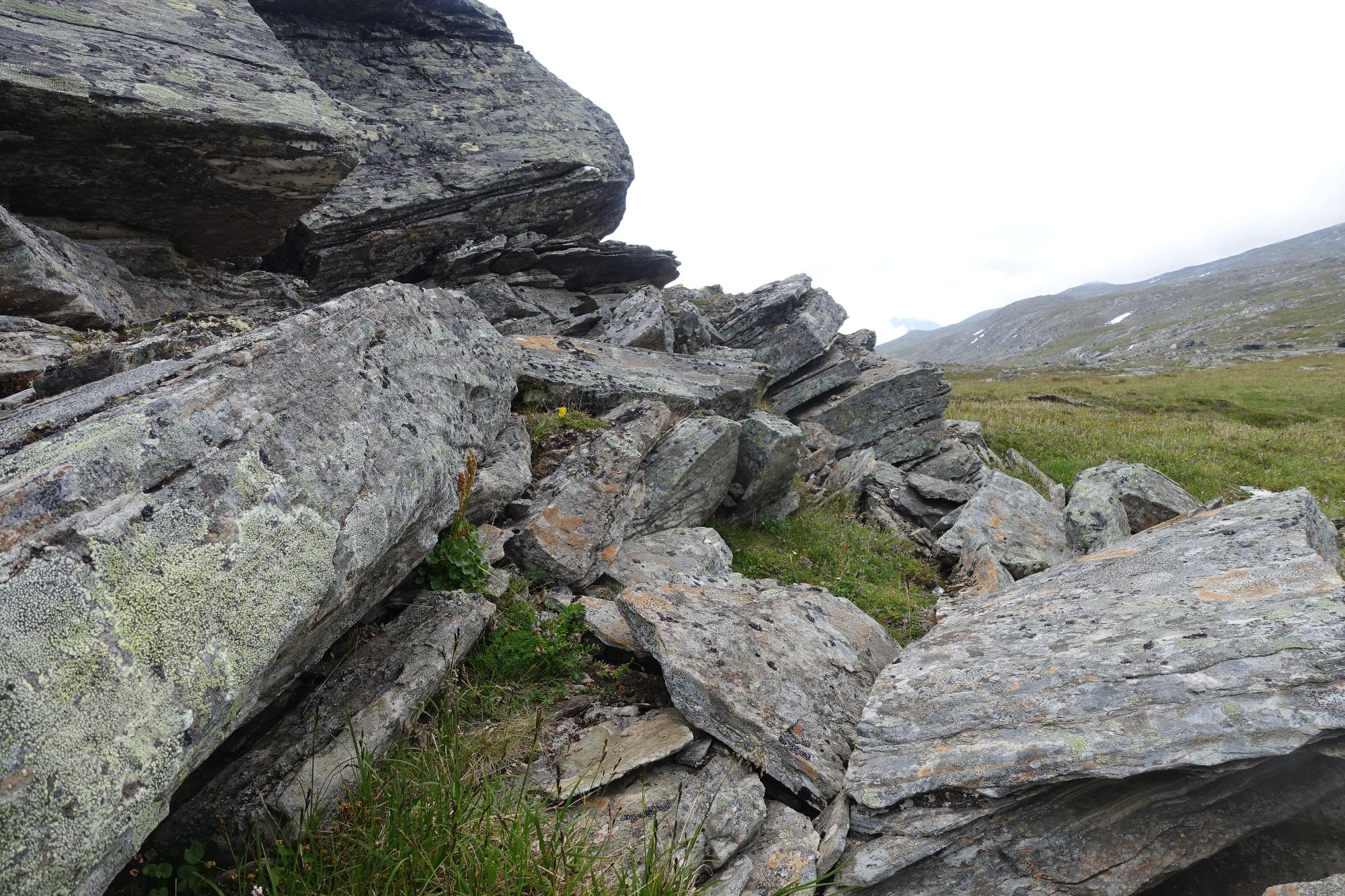 Biotopbild av stenparti med många växtarter. På bilden syns styvstarr, fjällsyra, fjällvedel, fjällfibblor, fjällbinka m.m. Här växer också härjedalsgröe och bergdraba.