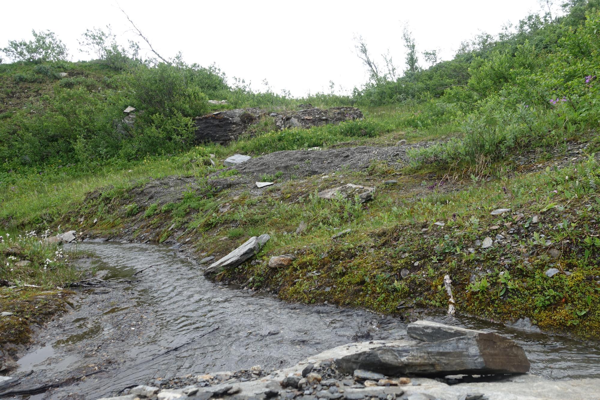 - Biotopbild av bäck med tydliga svämavlagringar. På bilden syns bl.a. isvedel och polarull. På det kala kruset växer mörk fjällvedel och rödtandad fjällmaskros, närmare klipporna står härjedalsgröe.