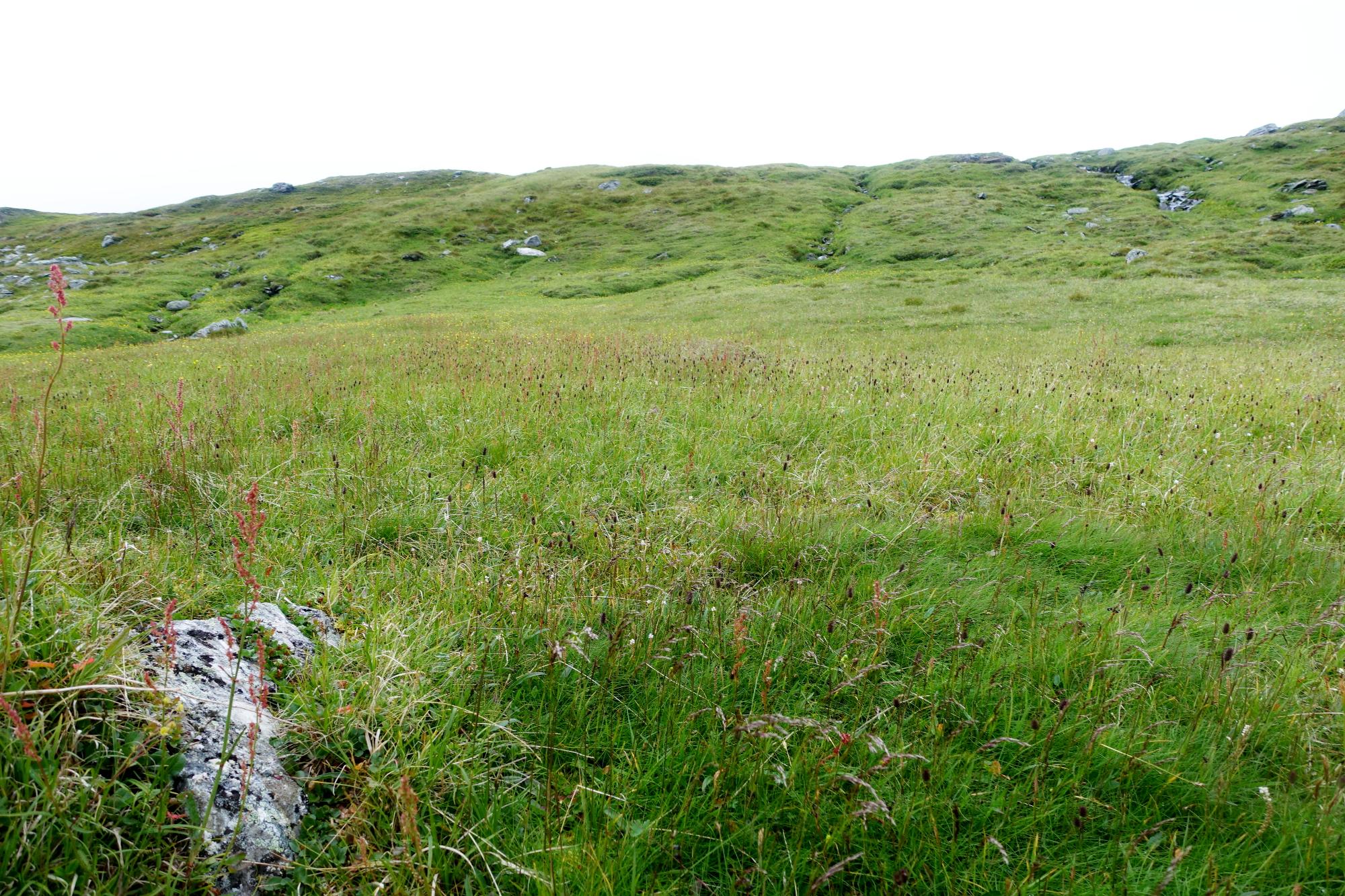 Biotopbild av fjälläng, dominerad av kruståtel och fjälltimotej. Även ormrot och ängssyra syns. Bilden tagen mot norr över Goahtnjunjes västända.
