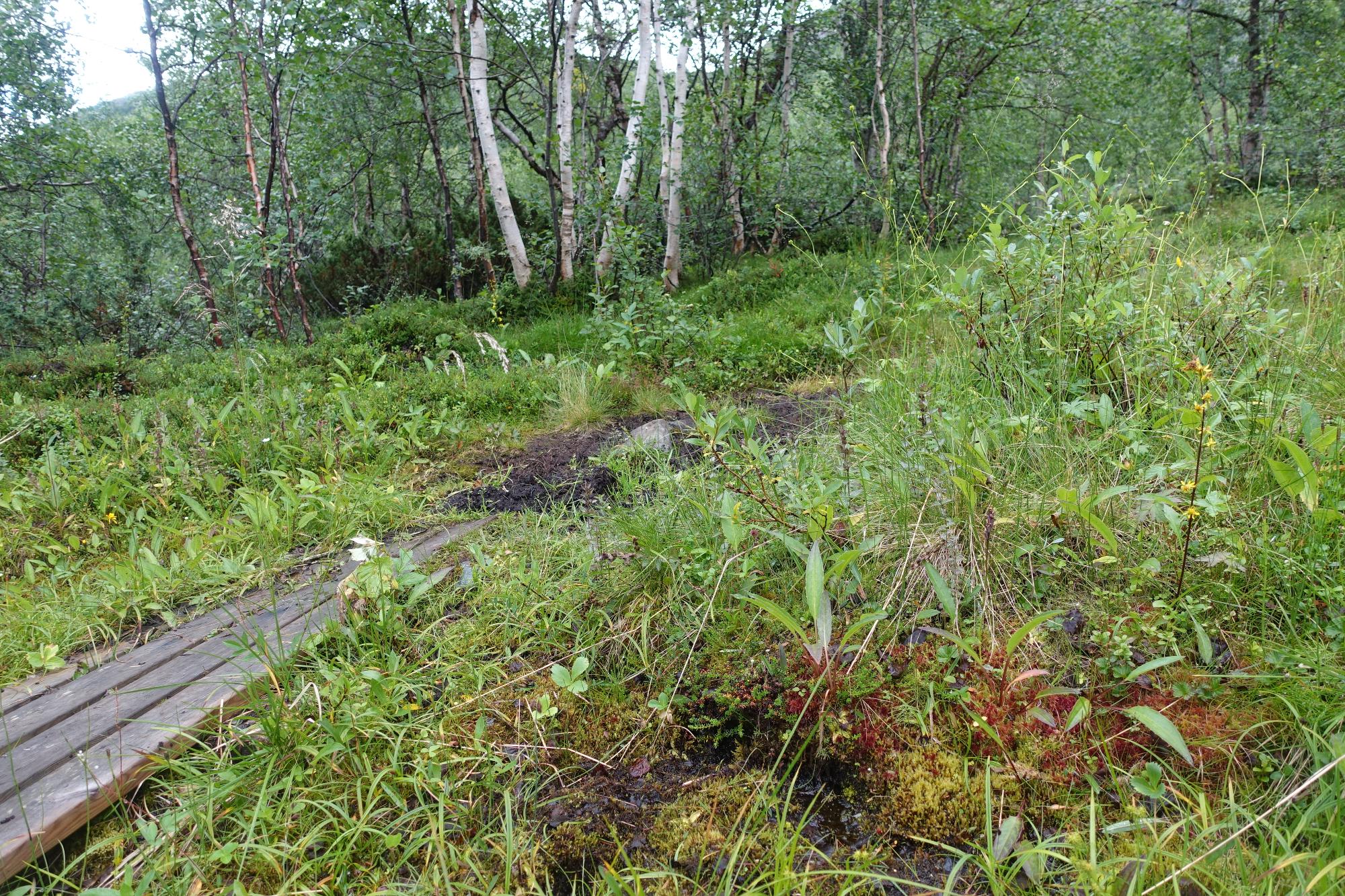 Biotopbild av fuktig fjällbjörkskog med spång och stig som leder från Såmmarláhpa mot Tarrekaisestugan. Vitgröe växer mitt på stigen. I övrigt höga smörblommor, gullris, vitmossa, grönvide m.m.