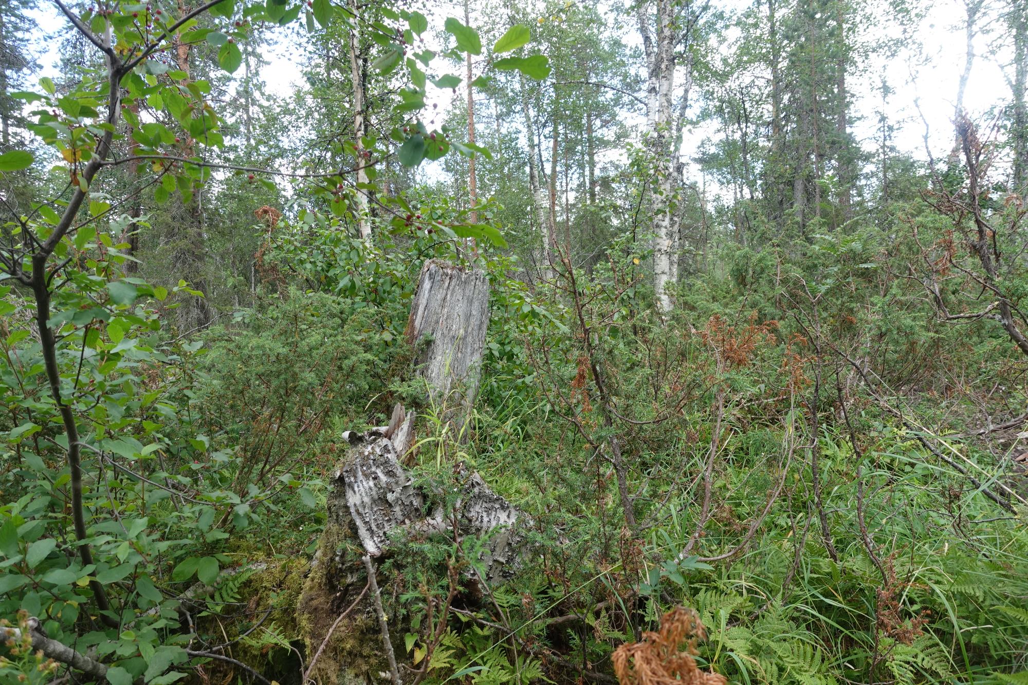 Biotopbild av blandskog med stora ensnår. Brakved till vänster. I övrigt syns bl.a. hultbräken och lundelm.