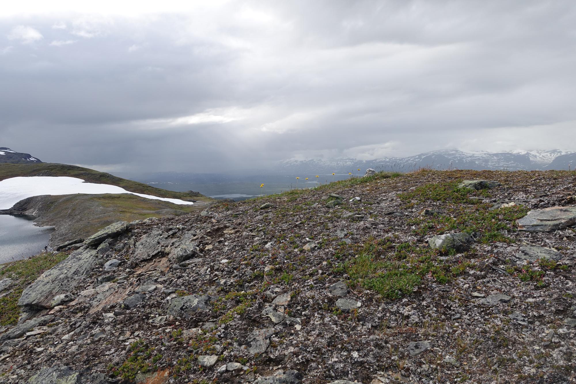 Biotopbild av fjällhed med fjällarnikor på krönet. Bland arnikorna växer några fjällklockor.I förgrunden syns odon och fjällsippa.