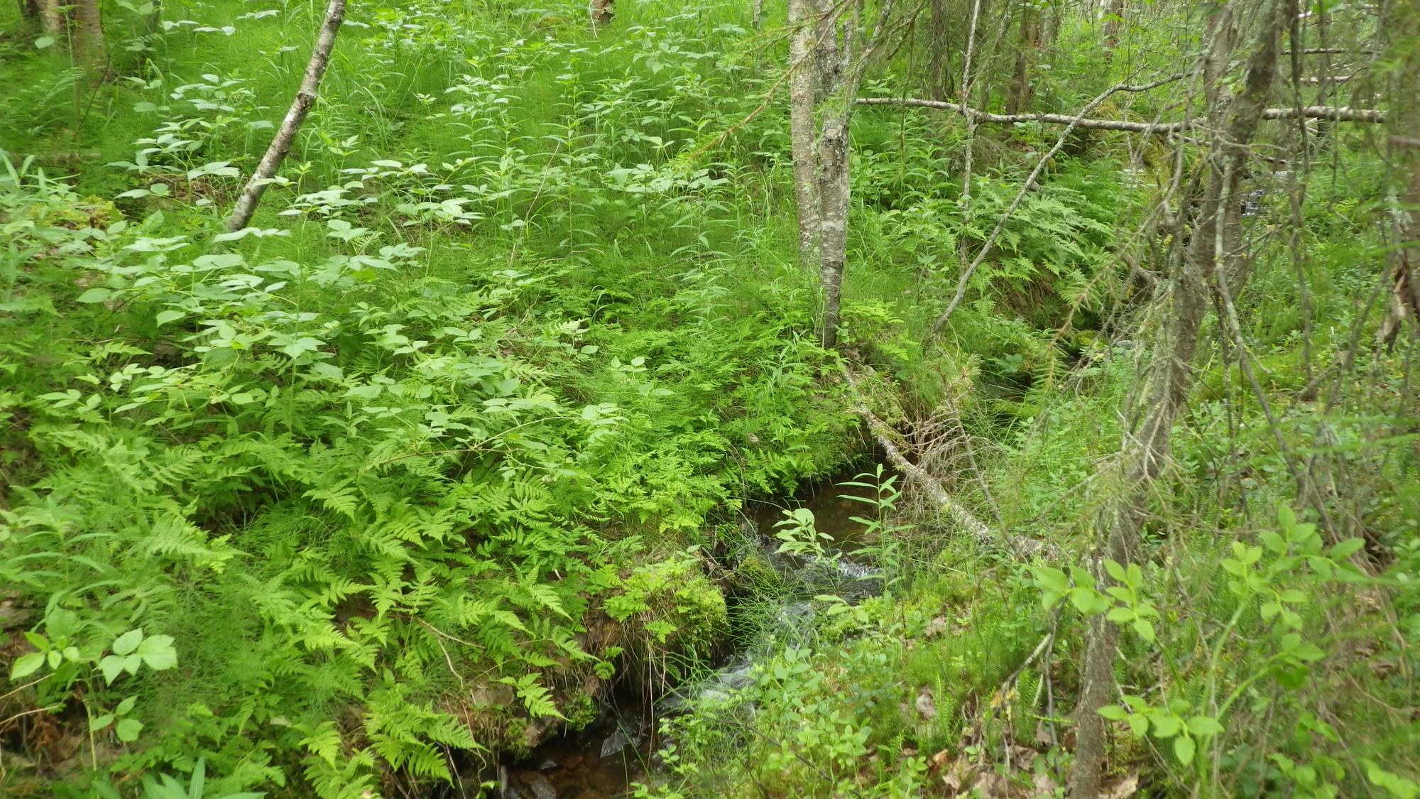 Biotopbild av blandskog kring kallkällbäck. Kring bäcken dominerar hultbräken, skogsfräken och hallon.