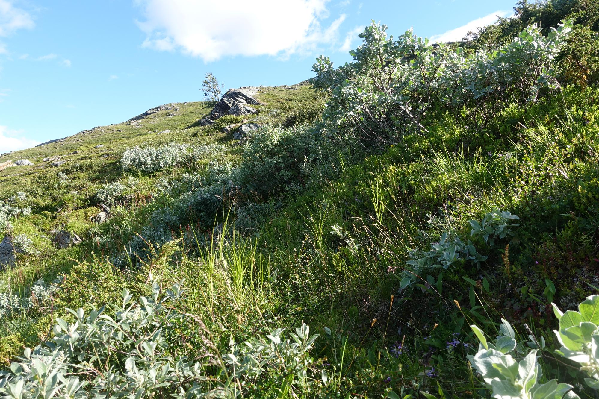 Biotopbild av fjällsluttning med hed och ängsmark. På bilden syns bl.a. ullvide, tuvtåtel, myskgräs, vårbrodd, ängssyra och fjällvedel. Även svartfibblor växer på lokalen. Längre bort i skyddat läge står den översta fjällbjörken.