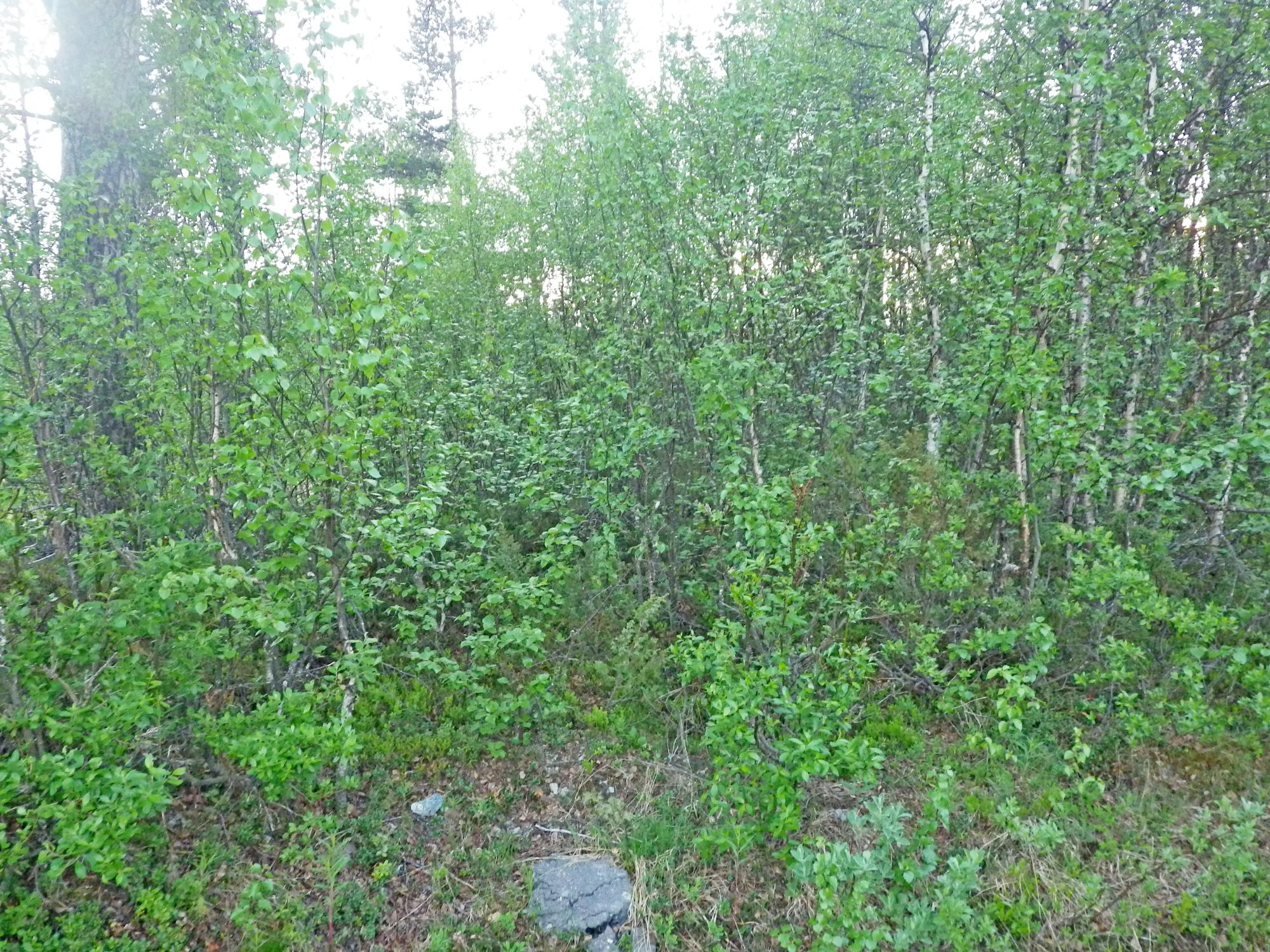 Biotopbild av videvegetation i kanten mellan grusplan och fjällbjörkskog av blåbärstyp.