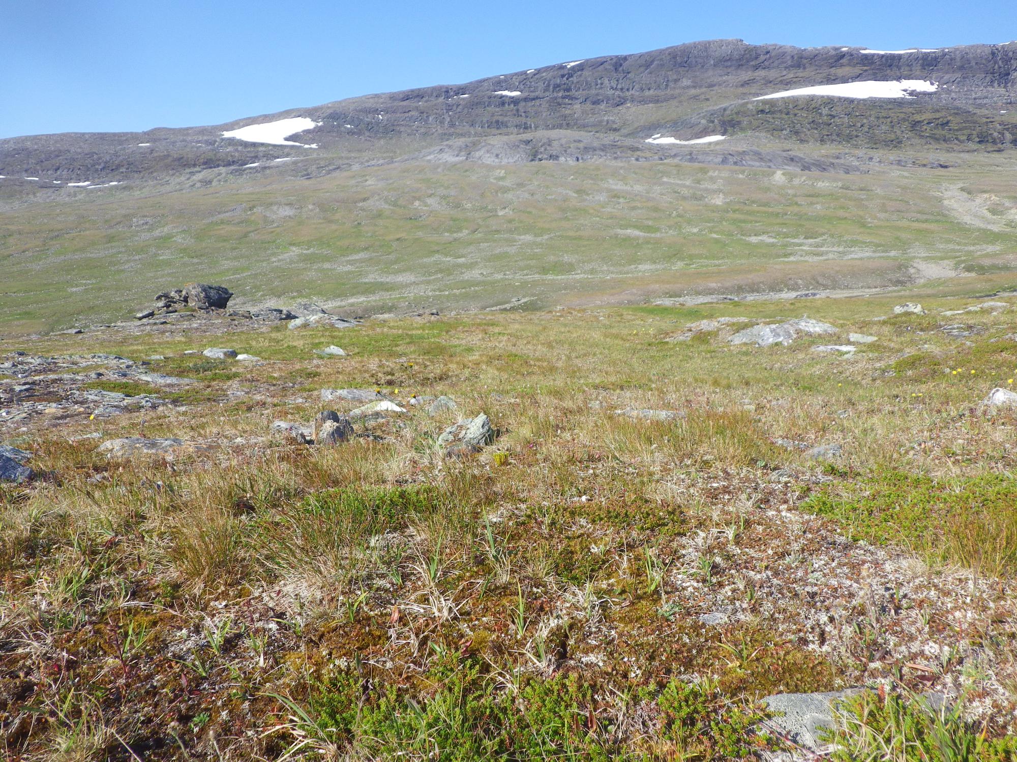 Biotopbild på fjälläng/hed med kråkbär, styvstarr och klynnetåg. Svartfibblor syns som gula prickar. Bilden tagen mot SV med Näjddatjåhkkå i bakgrunden.