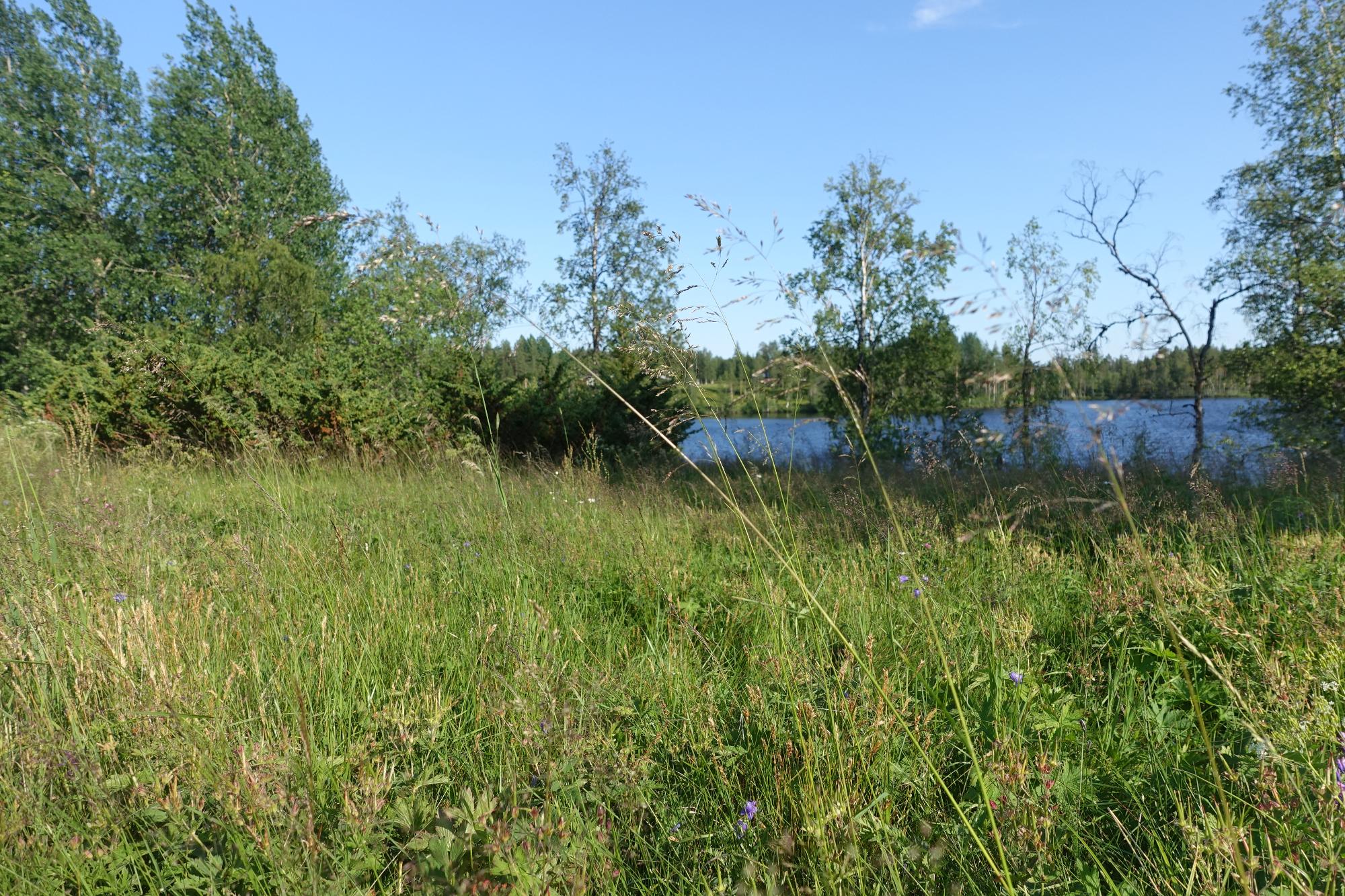 Biotopbild av f.d. odlingsmark med tuvtåtel, vårbrodd och midsommarblomster. Längre bort syns prästkragar. Bilden tagen mot söder över Abborrträsket med kulturmark vid Renborg i bakgrunden.