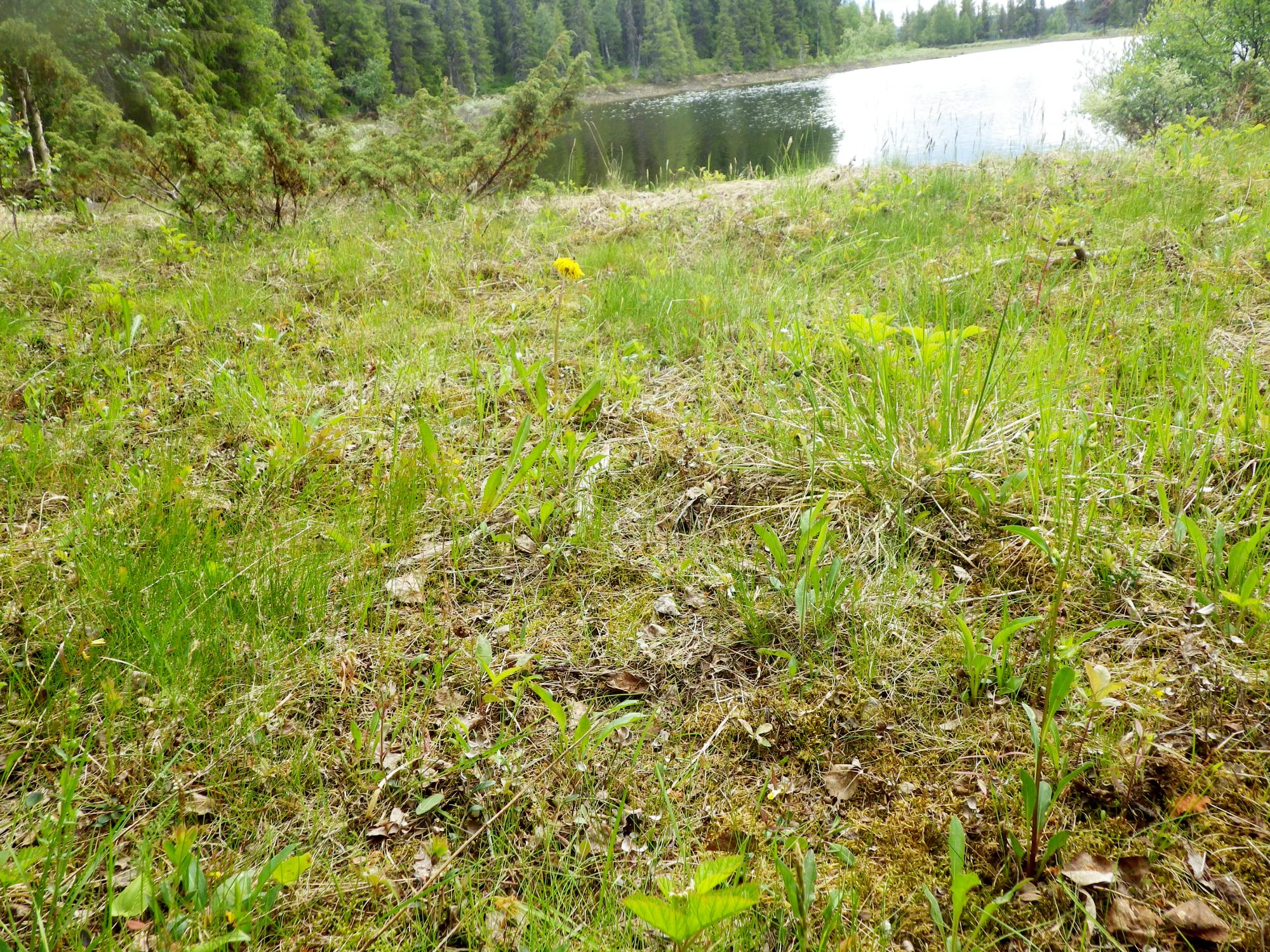 Biotopbild av lågörtäng vid sjöstrand med maskrosor (AJN:008507) i centrum. I övrigt syns gullris, stenbär och vårbrodd. Bilden tagen längs avan ovanför Laisluspen mot söder.