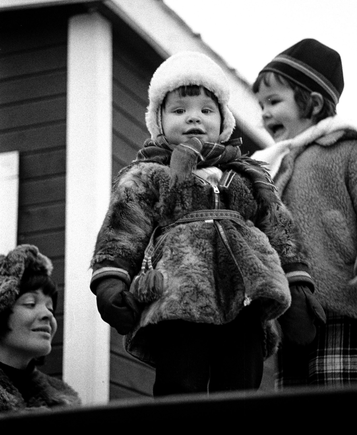 Två barn stå uppe och titta på marknadsvimmel. Obs. Jokkmokks barn därav flickan Kuoljok.