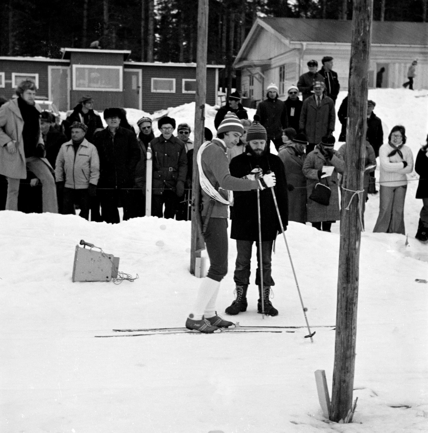 - Same SM hölls på närliggande Talvatissjön kring vintermarknaden. Lars-Matto Åstot beredd att starta. Tomas Öberg vid startblocken. Samernas FHSK lärare Bengt Holmgren längs till vänster bland folket. Gamla omklädningshus för bad till vänster uppe på kullen. Till höger nybyggt 'Fågelhuset' där U.S.A. gåvan av kanadagäss bodde