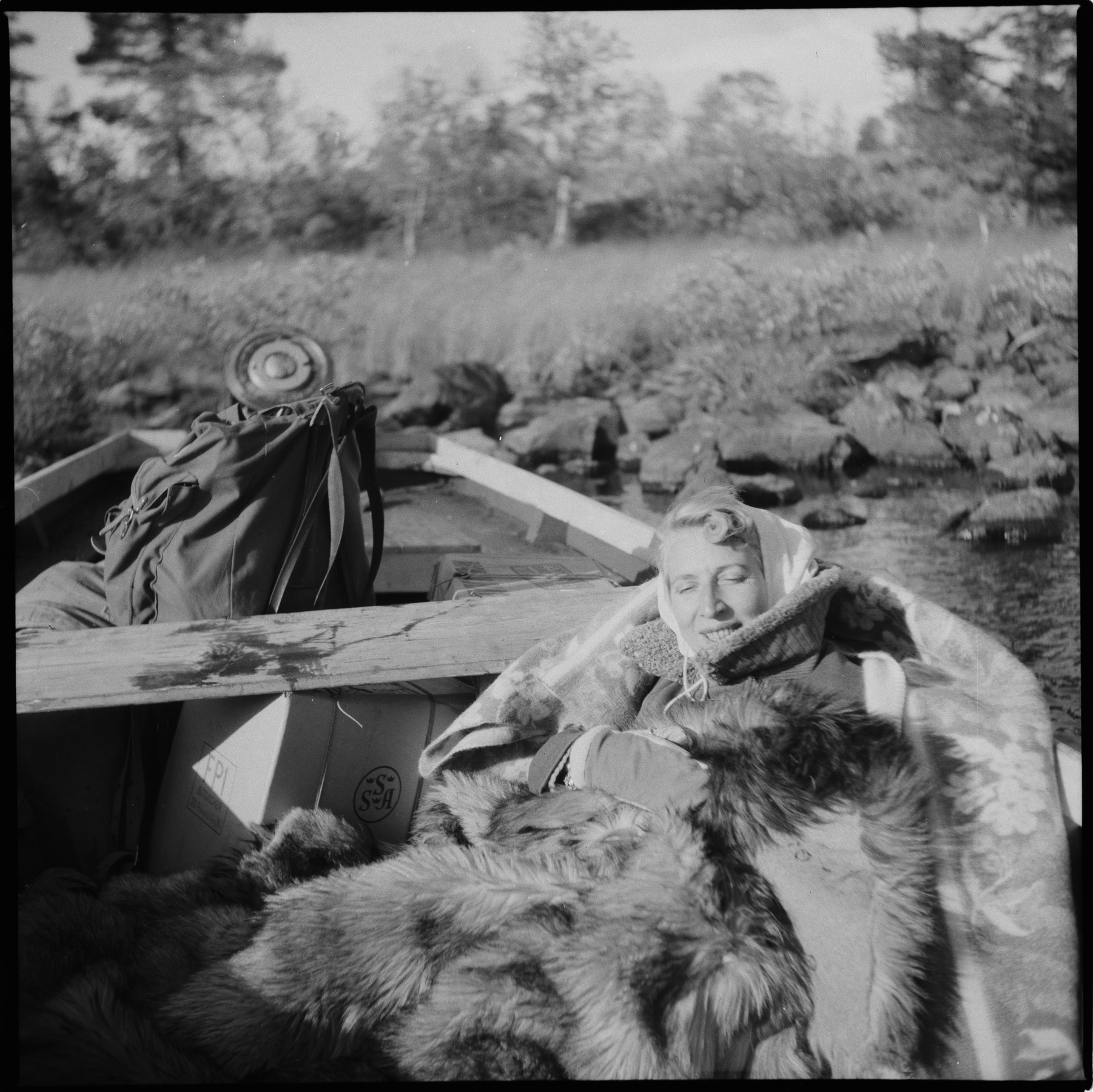 Maja Ruong, Israel Ruongs fru, halvligger i en träbåt insvept i en fäll