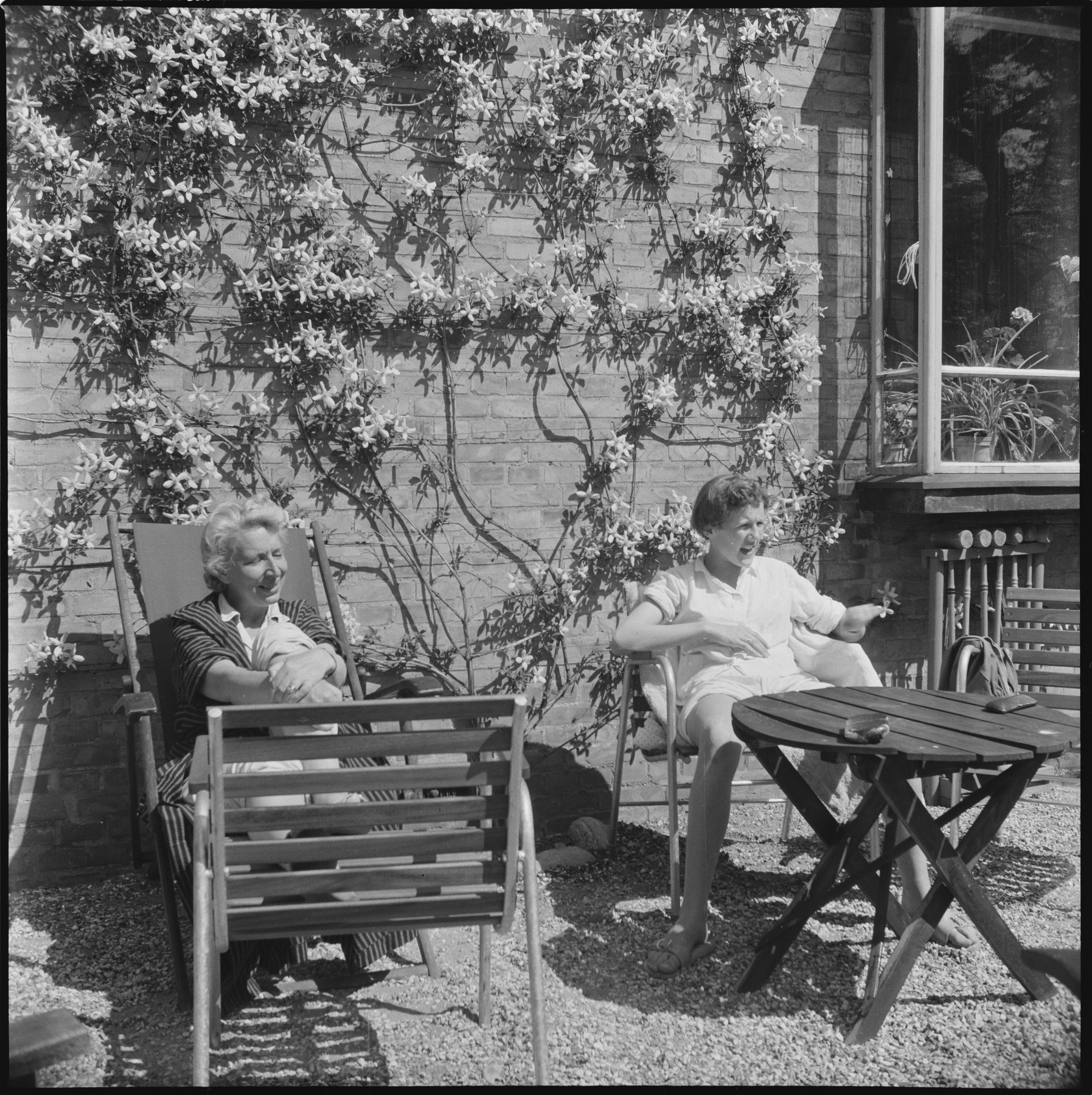 SameF:80:00445 :: sommar, kvinnor, trädgård, sola, solstolar