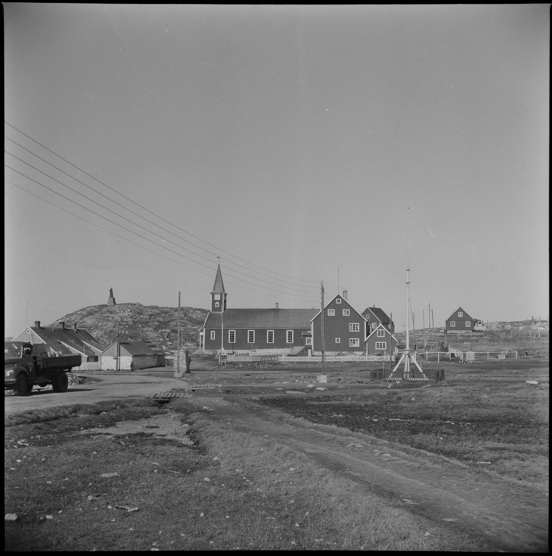 SameF:80:00457 :: lastbil, kyrka, samhälle, hus, by, sommar