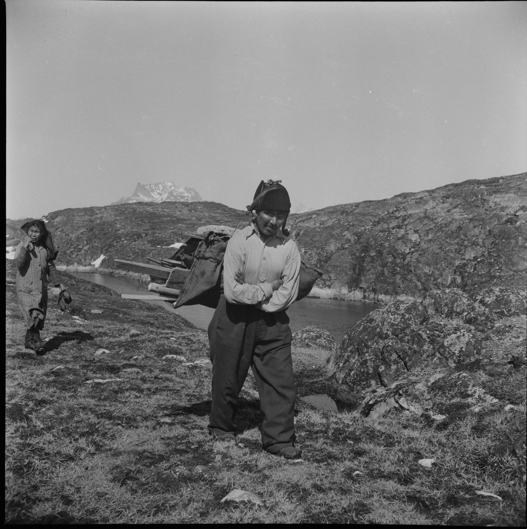 Kvinna bär virke, följd av en flicka